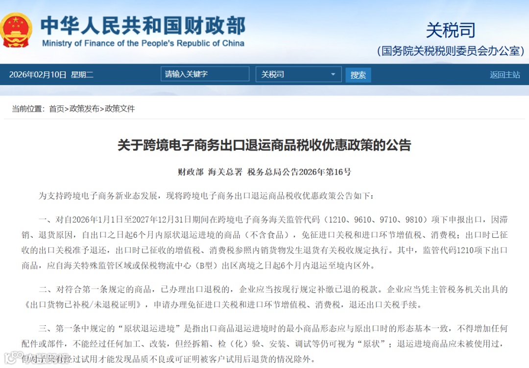 根据公告,对自2026年1月1日至2027年12月31日期间在跨境电子商务海关监管代码(1210、9610、9710、9810)项下申报出口,因滞销、退货原因,自出口之日起6个月内原状退运进境的商品(不含食品),免征进口关税和进口环节增值税、消费税;出口时已征收的出口关税准予退还,出口时已征收的增值税、消费税参照内销货物发生退货有关税收规定执行。其中,监管代码1210项下出口商品,应自海关特殊监管区域或保税物流中心(B型)出区离境之日起6个月内退运至境内区外。