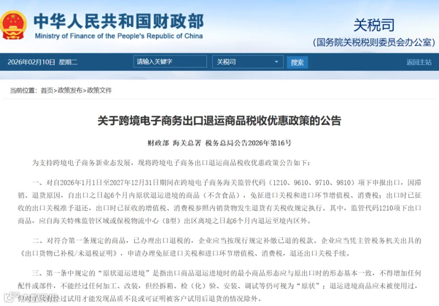 为支持跨境电子商务新业态发展,财政部、海关总署、税务总局2月9日发布公告,公布了对跨境电子商务出口退运商品税收优惠政策。