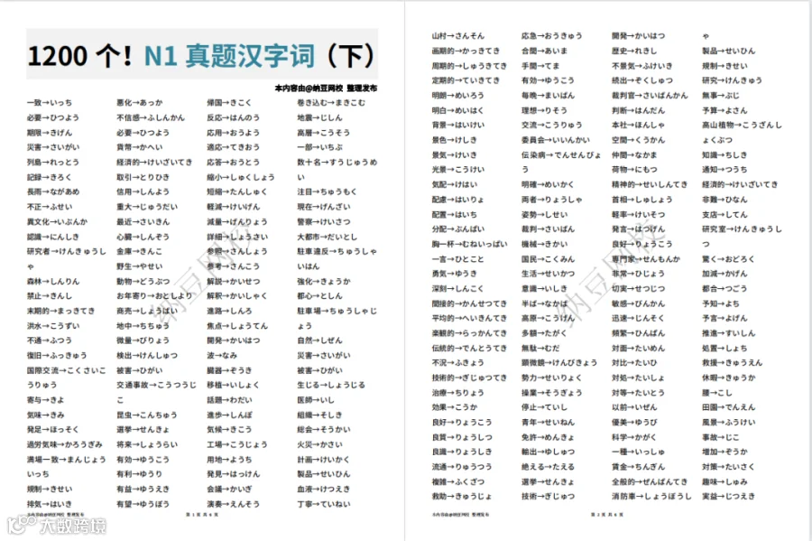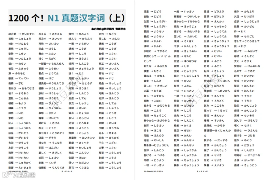 这份【1200个N1真题汉字词】分为上、下两个文件,共有11页。