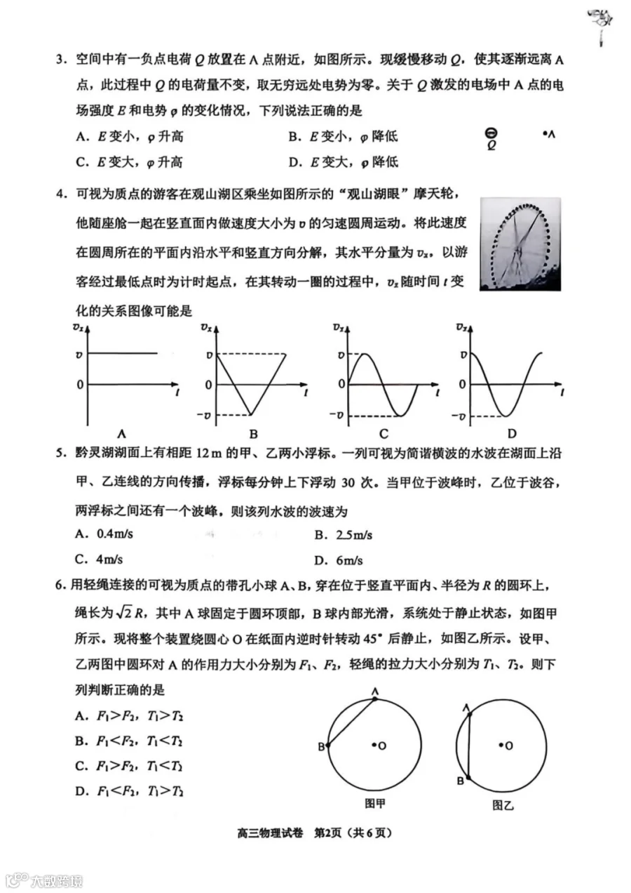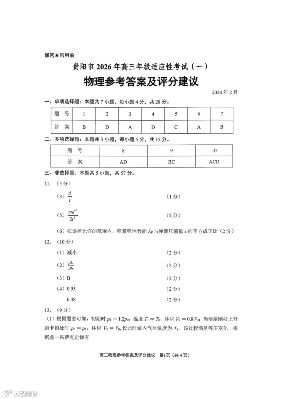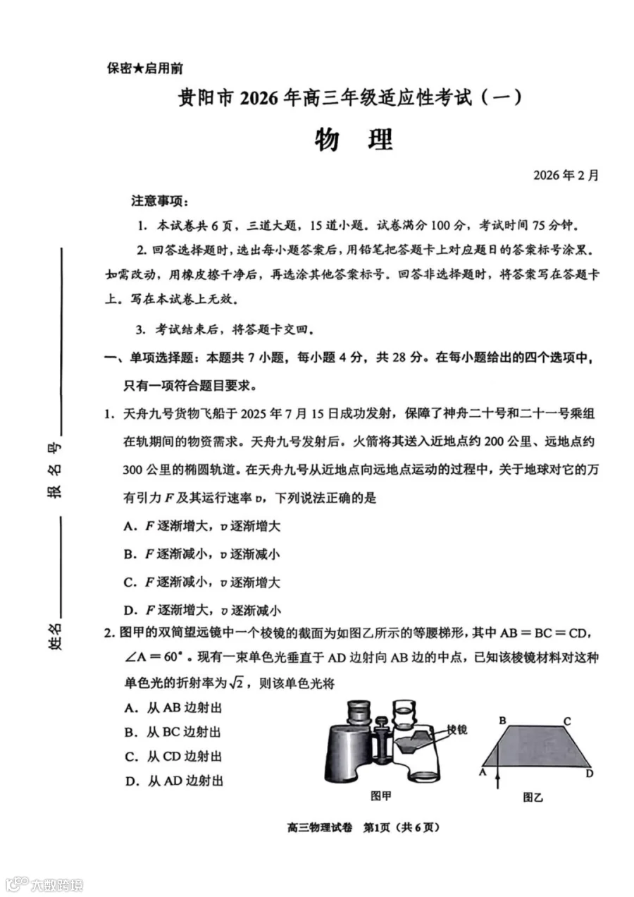 作者寄语:2026届贵阳市高三年级适应性考试(一)物理试题+答案,7天有效领取,手慢无!!!