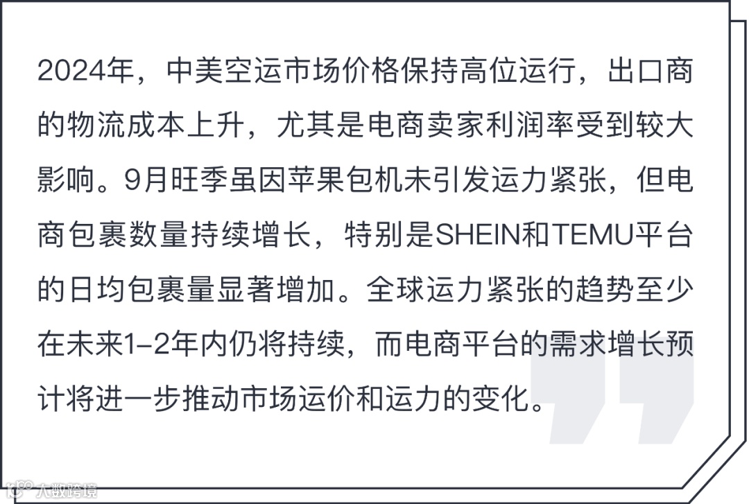 与此同时,跨境电商的崛起不仅仅推动了空运市场的繁荣,也让物流公司更加依赖电商平台的订单量。平台对包机资源的整合能力逐渐成为左右市场价格和运力的重要因素。因此,未来的中美空运市场,特别是高峰时期的价格波动和运力配置,更多地将由电商平台主导,而非传统的制造业。