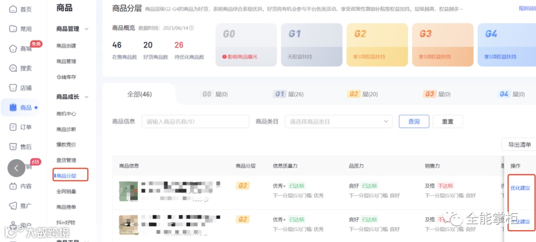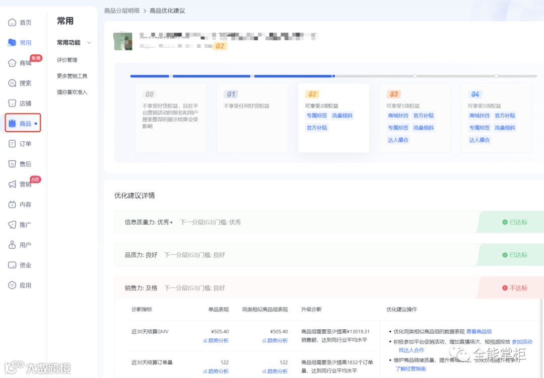 第二阶段:求发展(行业赛马) 店铺链接有基础动销了。链接每天就会产生曝光、点击、转化等数据。筛选出有潜力的款。 在抖店后台-商品分层页面,抖音官方非常明确的告诉你了,你和竞争对手的链接差距指标是什么。缺多少销售额,多少订单量。 图一