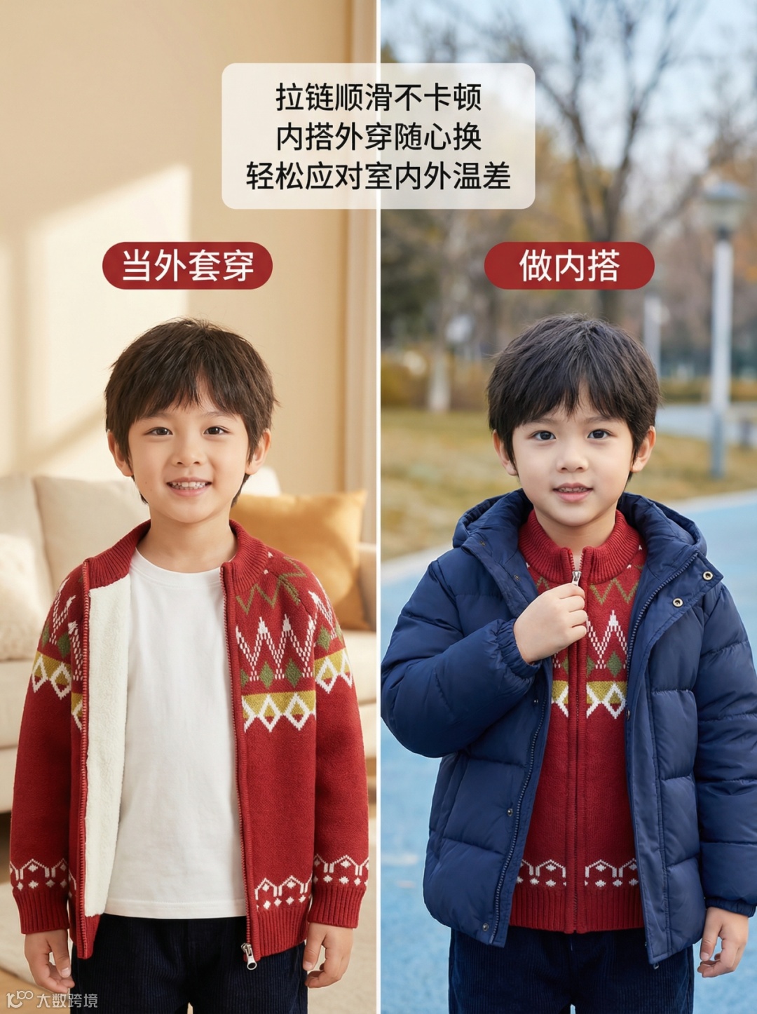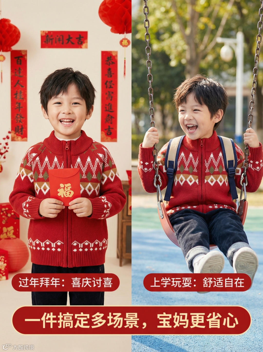 5. 使用场景 (Scenario):过年去拜年穿在羽绒服里当内搭、在室内玩耍当外套。