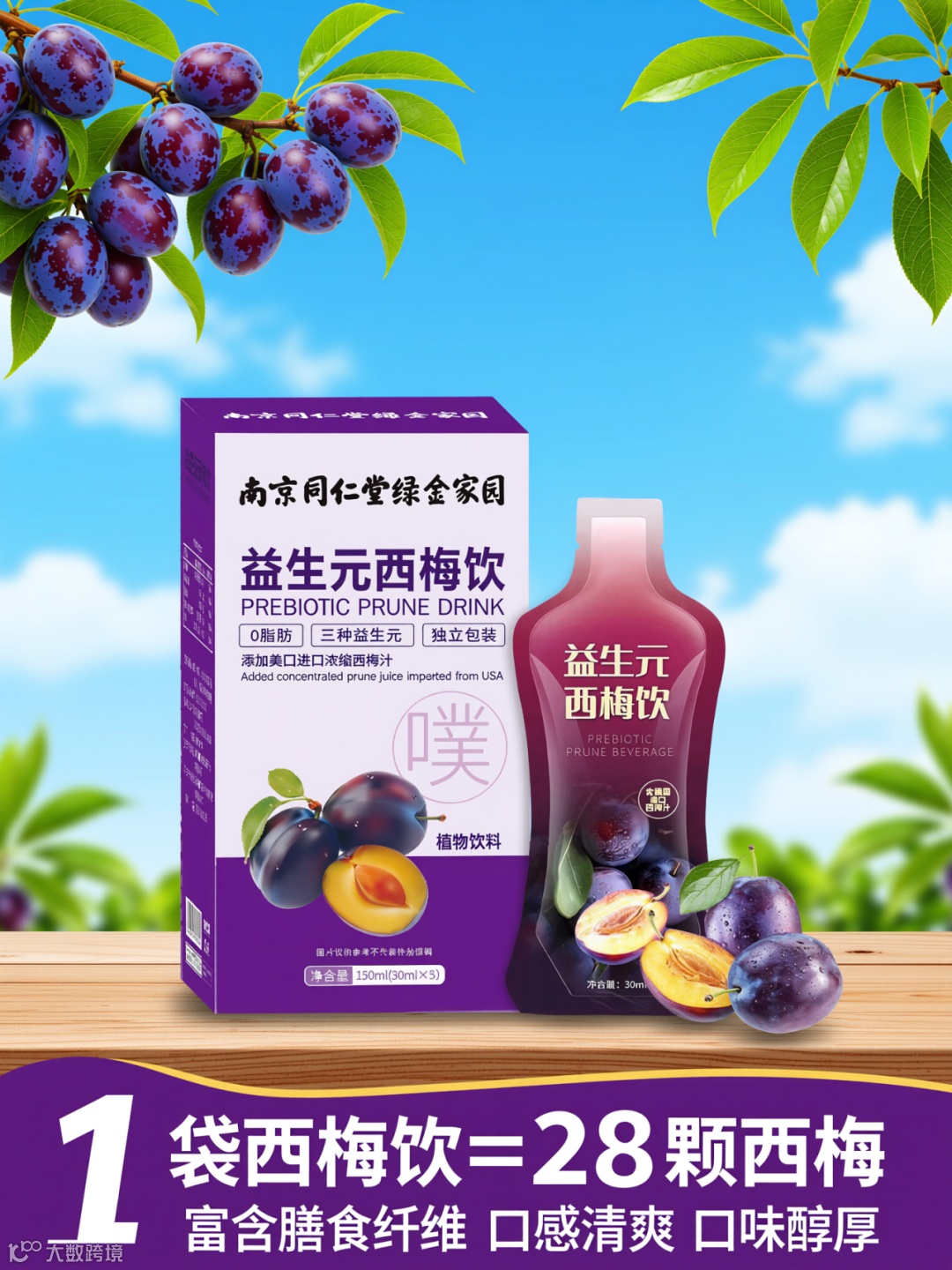 提示词: 这是一张色彩鲜亮、充满夏日活力的益生元西梅饮的电商促销图。画面以蓝天、绿叶和木质台面为背景,营造出清新自然的氛围。