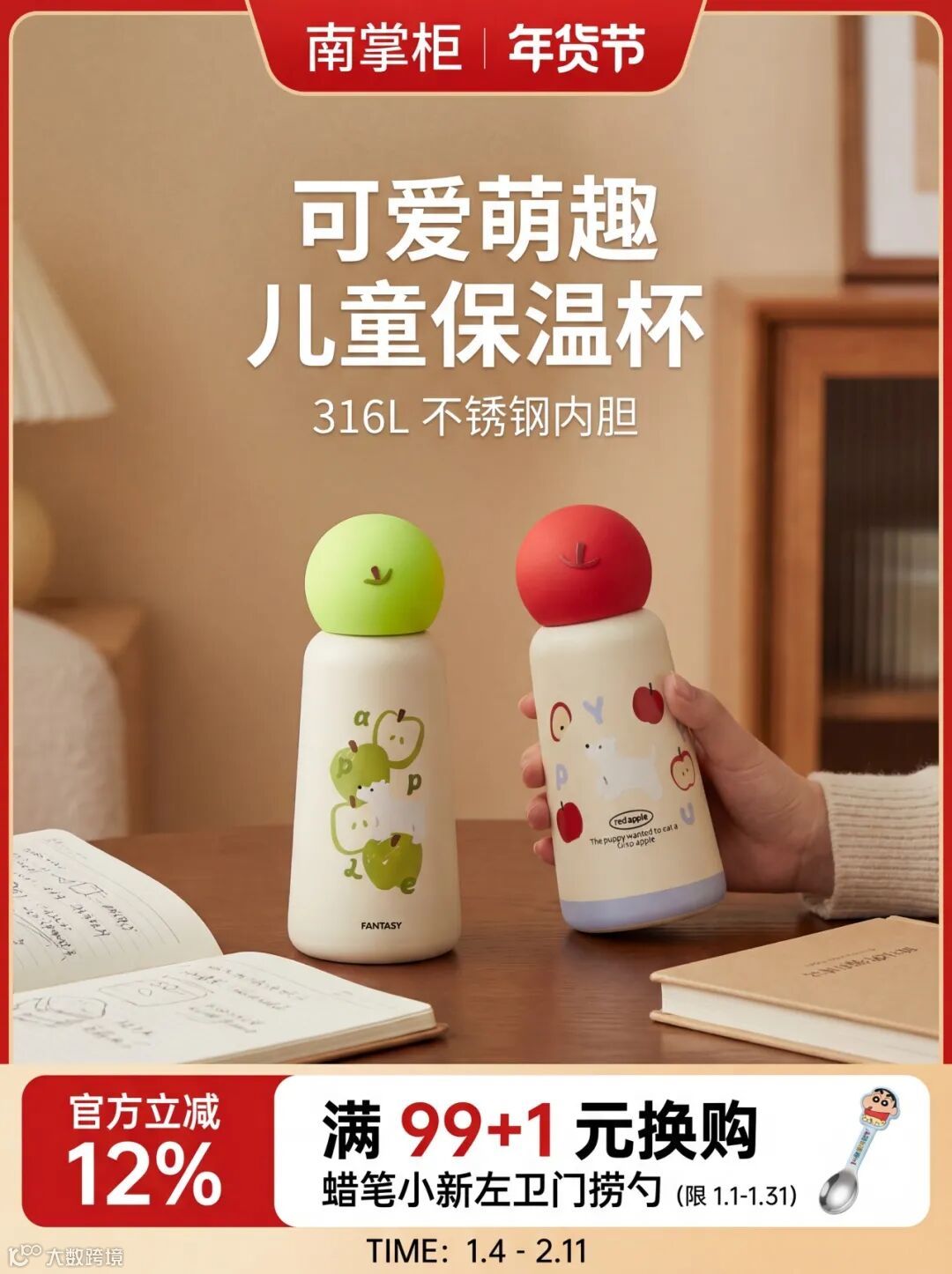 提示词:这是一张南掌柜品牌儿童保温杯的电商促销图,最上方是红色横幅,左侧是 “南掌柜” 品牌 ,右侧标注 “年货节” 主题,直接点明品牌与促销背景。