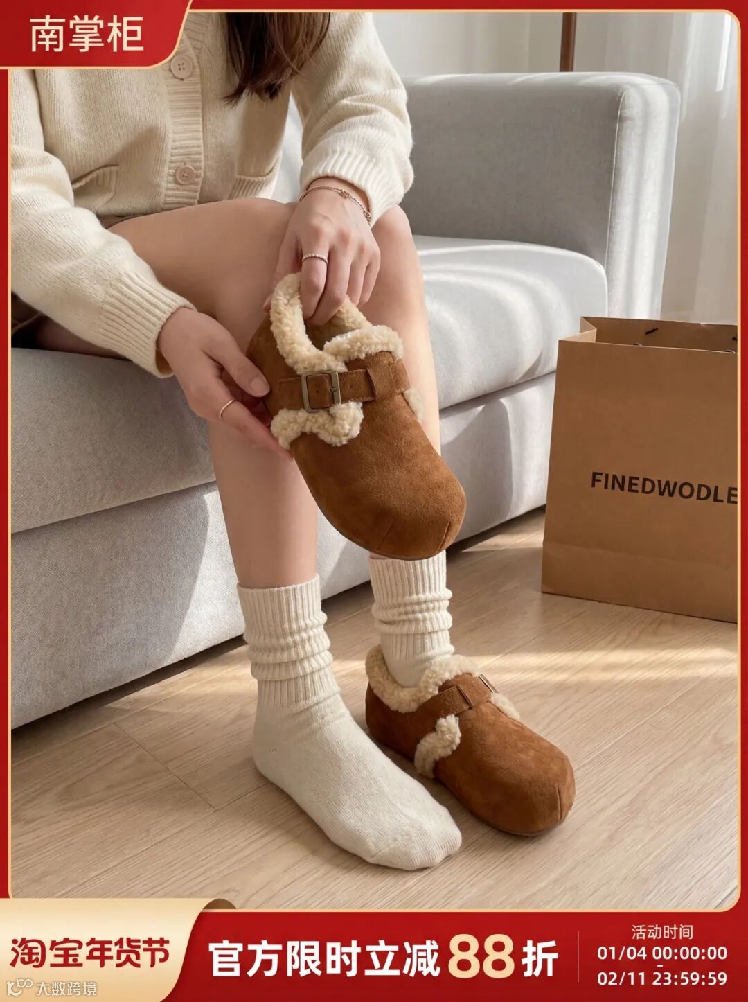 提示词:这是一张带有电商促销属性的鞋子穿搭展示图。一位穿着米白色针织开衫的女性(仅露出上半身下半部分与腿部),皮肤白皙,搭配同色系堆堆袜,整体色调统一柔和。她正坐在浅灰色沙发上,双手捧着一只图1的毛绒边勃肯鞋,呈向镜头展示状态;脚上已经穿着另一只同款鞋子,另一只脚只穿了袜子,通过 “手持 + 上脚” 的组合,直观呈现鞋子的上脚效果与细节。
