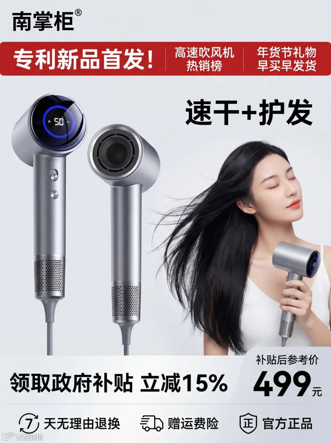 提示词:这是一张南掌柜品牌吹风机的电商促销图,背景风格:整体采用纯净的浅灰色渐变背景,简洁干净,无多余干扰元素,让视觉焦点完全集中在产品与人物上。