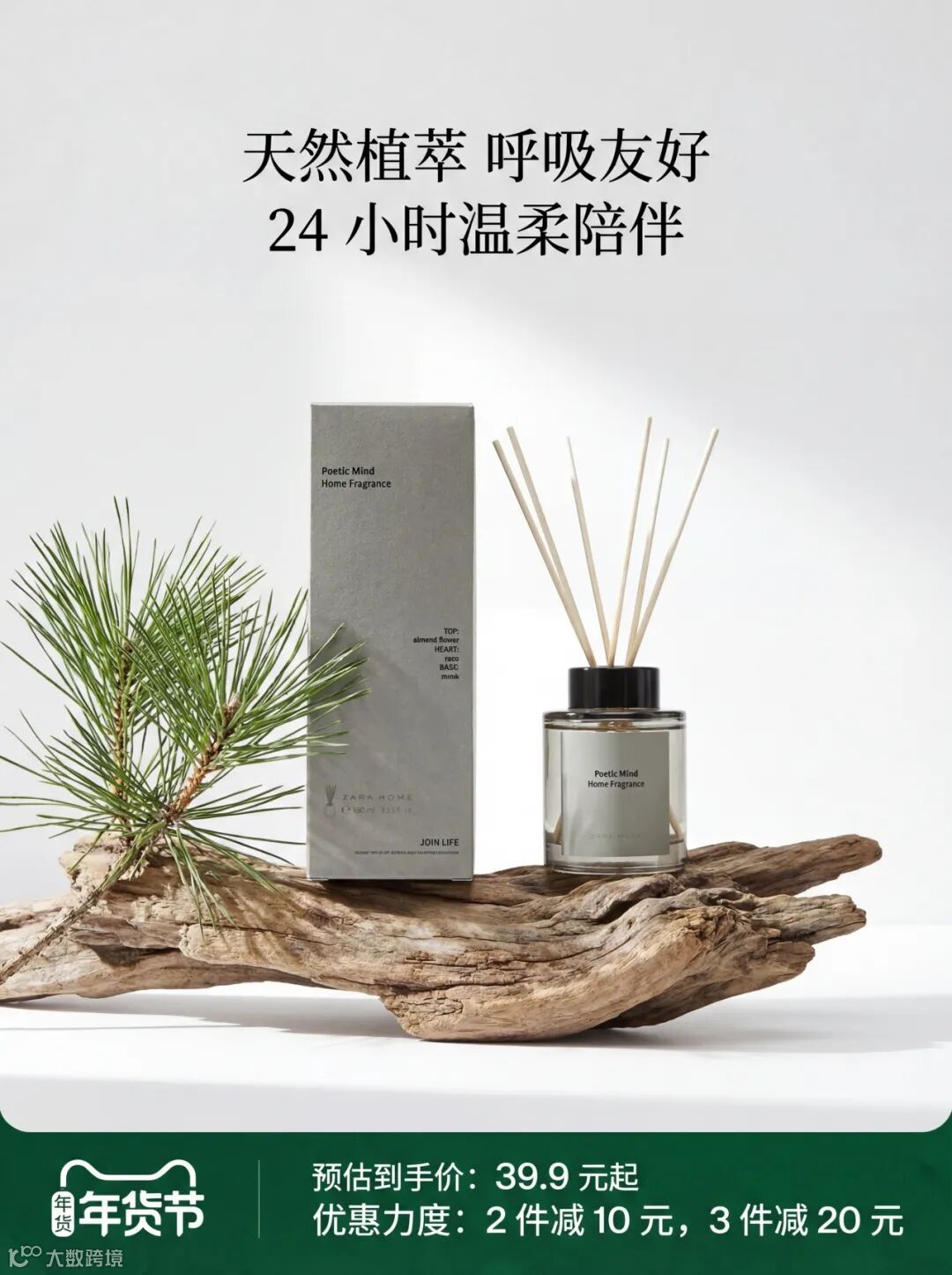 提示词:这是南掌柜香系列无火香薰的产品促销图。(不改变图1的产品)整体风格雅致、禅意十足,以浅色调为底色,搭配松枝与枯木的布景,营造出自然、舒缓的东方美学氛围,精准传递了 “天然植萃” 的产品理念。
