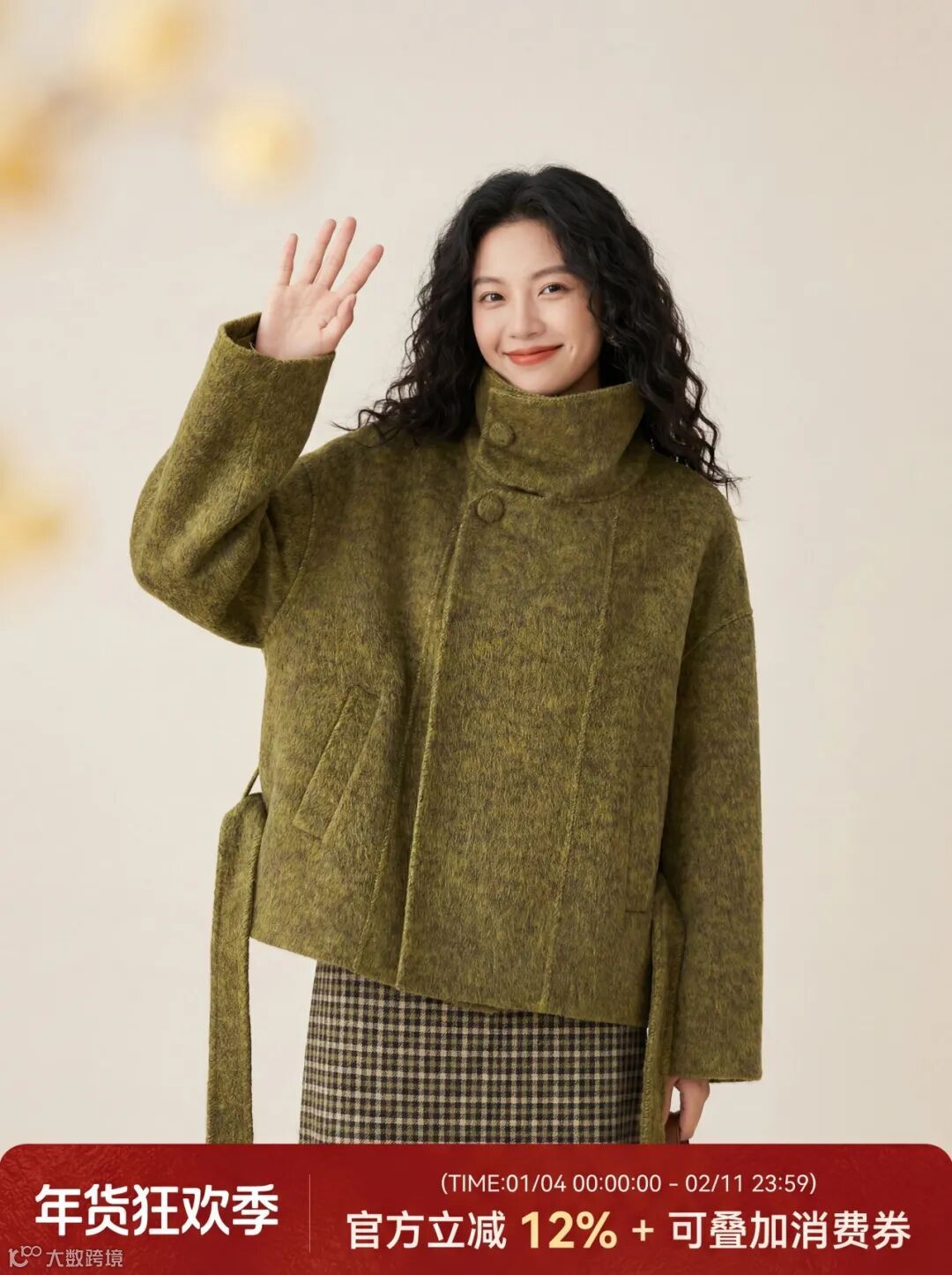 提示词:这是一张女装毛呢外套的电商宣传图,整体风格温柔松弛,兼具质感与亲和力,重点突出服装的简约设计与节日促销氛围。