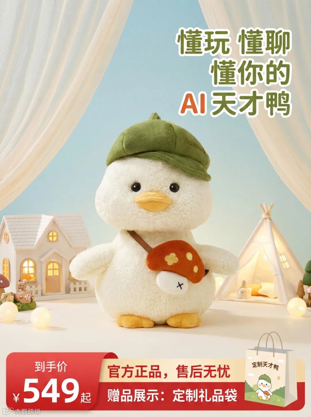 产品 Slogan:右上角的 “懂玩 懂聊 懂你的 AI 天才鸭” 直接点明了这款玩偶的核心卖点 —— 具备 AI 互动功能,能陪伴、会聊天。