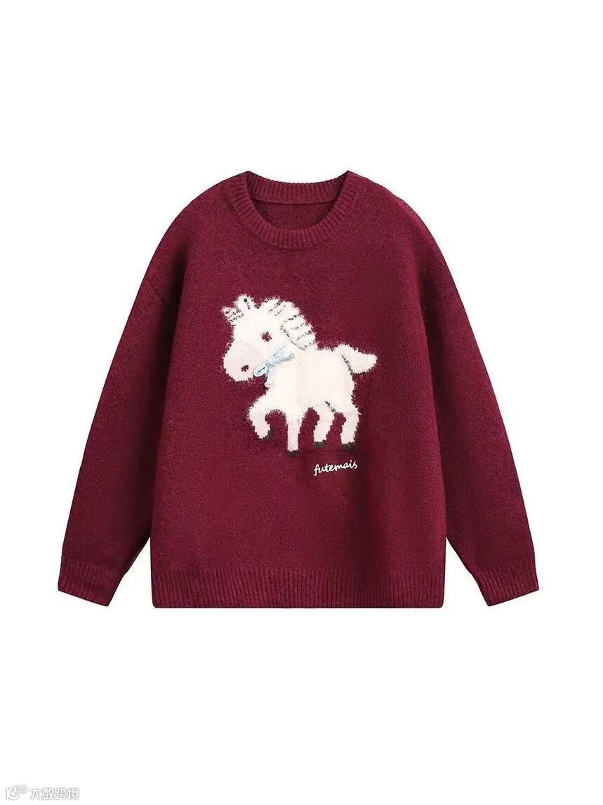 背景:采用干净的浅灰色纯色背景,无多余干扰元素,让酒红色毛衣成为视觉焦点,同时衬托出新年主题的温暖氛围。