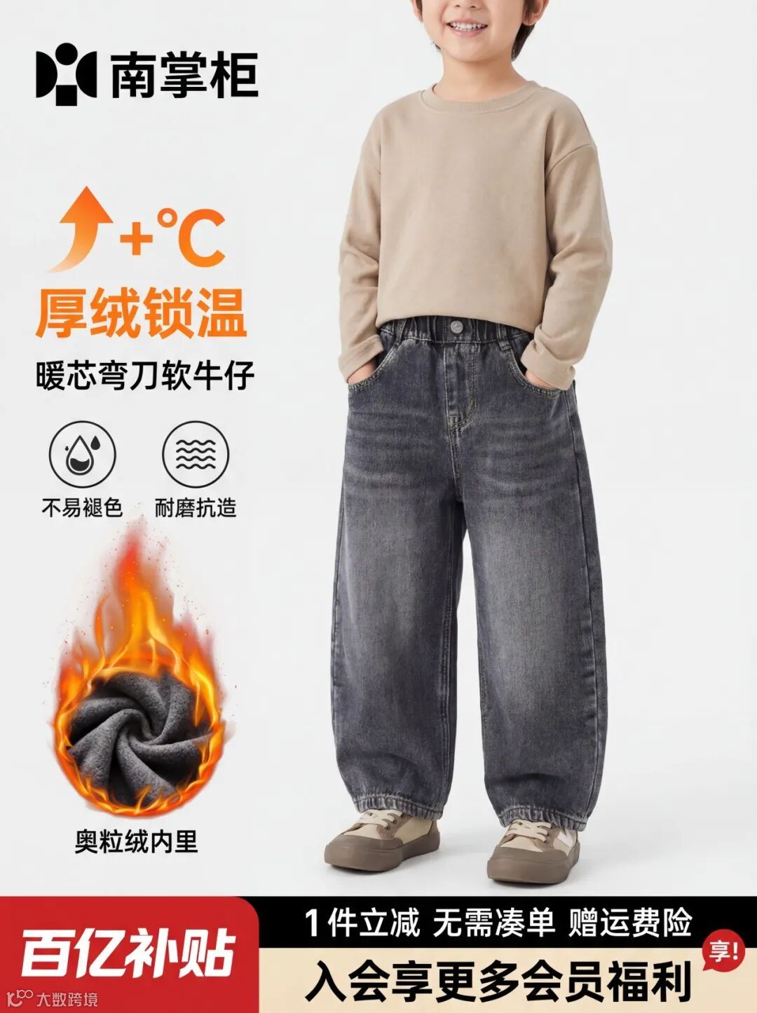 提示词:这是一张儿童加绒牛仔裤的电商宣传图,整体风格活力实用,重点突出裤子的保暖性、功能性与舒适感,视觉上兼具童趣与说服力。
