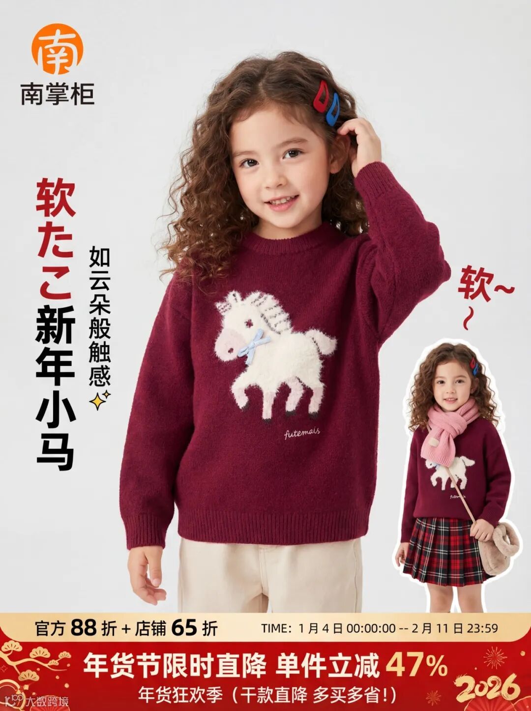 提示词:这是一张儿童新年主题毛衣的电商宣传图,整体风格温暖喜庆,兼具童趣与节日氛围,重点突出毛衣的柔软质感与新年氛围感。