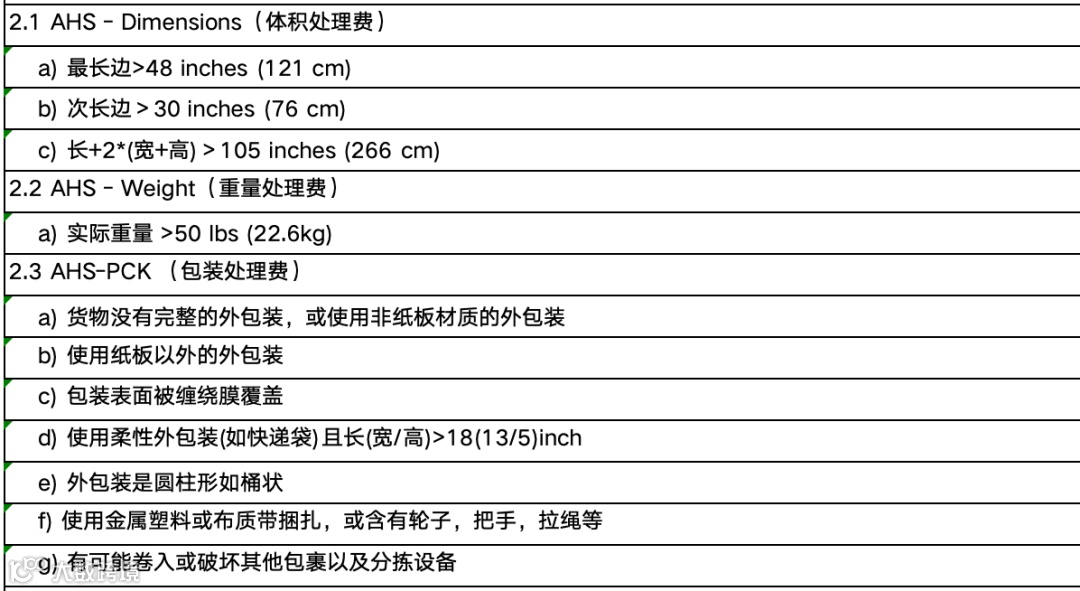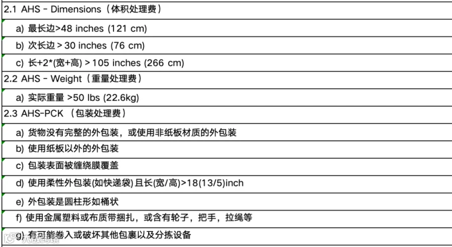 需重点关注AHS和Oversize的规则,以便尽可能优化产品设计和包装;尤其是对于接近临界值的产品,可能几厘米的尺寸优化就会带来几十美元的尾程成本节省。相关的收费规则: