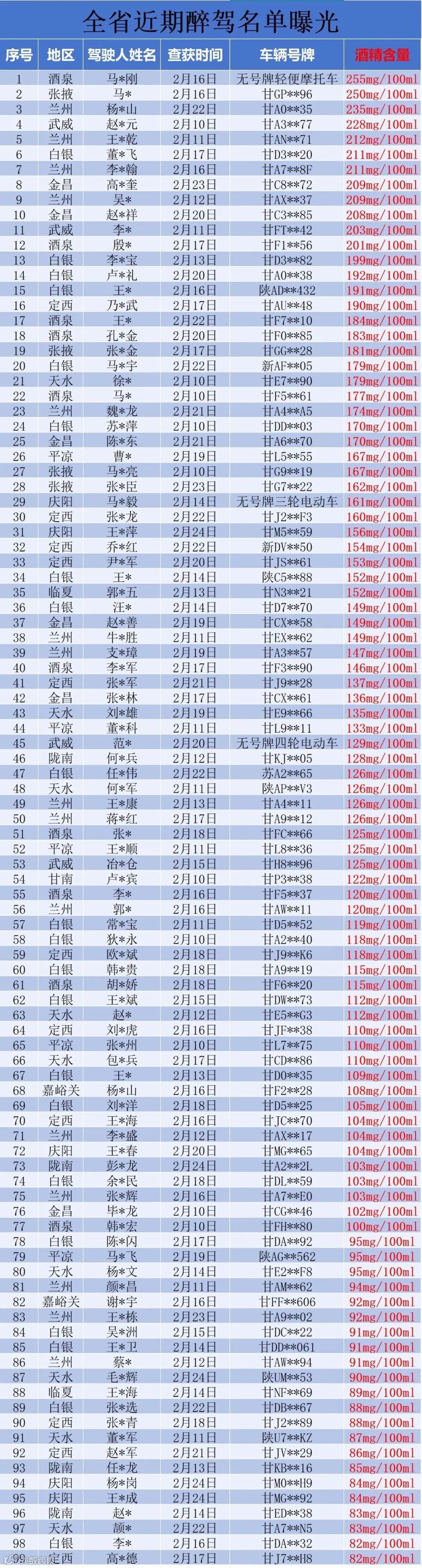 为严厉打击酒醉驾违法行为,全力维护道路交通安全秩序,切实保障人民群众生命财产安全,春运期间,甘肃公安交管部门持续保持严查严管高压态势,不断强化路面执法管控力度。现将近期查处的醉驾违法名单予以曝光(2月10日以来),公安机关将严格依法处理!希望广大驾驶人引以为戒,深刻认识酒醉驾的严重危害性,自觉遵守交通法规,确保自己和他人安全。