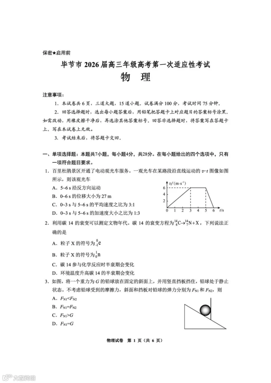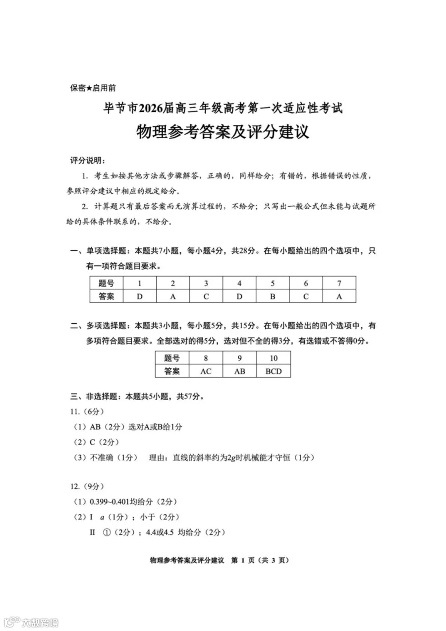 作者寄语:2026届毕节高三上学期一模物理试题+答案,7天有效领取,手慢无!!!