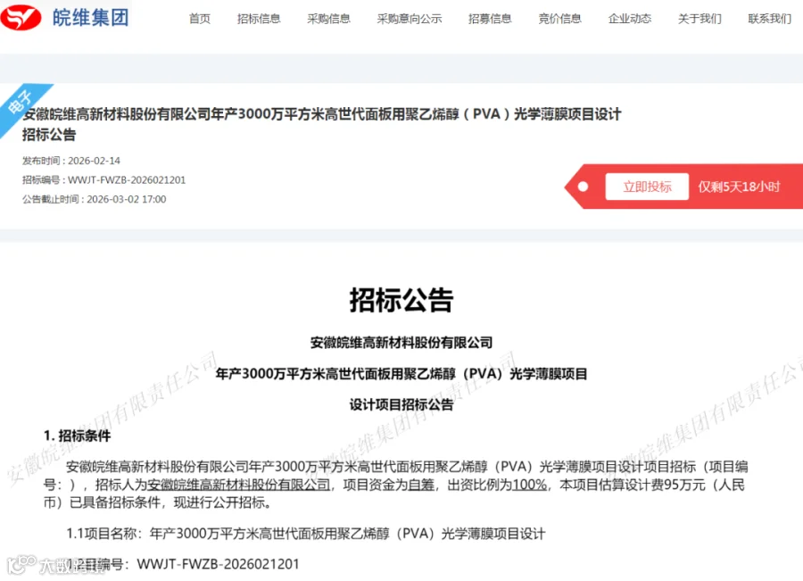 2.2项目建设规模:安徽皖维高新材料股份有限公司为扩大生产规模,拟建年产3000万平方米高世代聚乙烯醇(PVA)光学薄膜项目,总投资约66129.41万元,本期新建生产线2条。现对该项目设计进行公开招标。