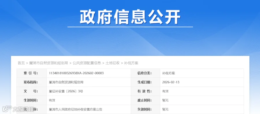 根据《中华人民共和国土地管理法》第四十七条、第四十八条,《中华人民共和国土地管理法实施条例》第二十七条、第二十八条以及《安徽省土地征收及补偿安置办法》第十一条、第十二条等规定,依据《巢湖市人民政府征收土地预公告》(巢征预告〔2026〕1号)开展的拟征收土地现状调查、勘测定界成果审核及社会稳定风险评估结果,拟征收半汤街道办事处战前村委会东湖村民小组9.1155亩。巢湖市政府组织自然资源、财政、农业农村、人力资源和社会保障等部门拟定了征地补偿安置方案,现将方案有关事项公告如下。
