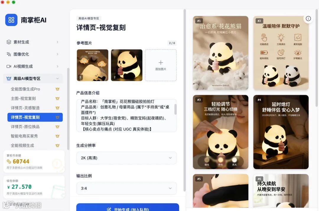 上传产品图和详情页参考图即可,生成图片比例可自由选择。