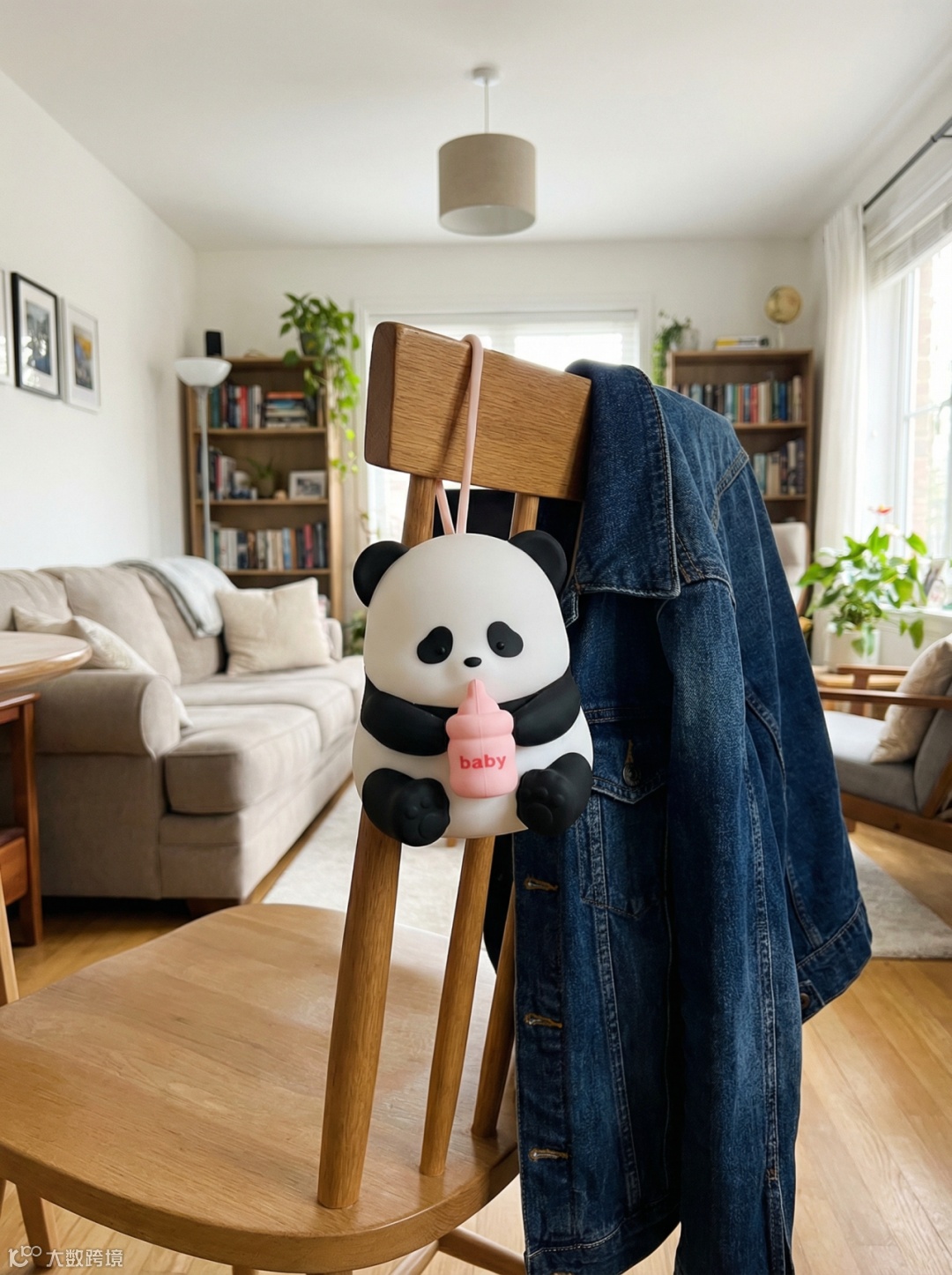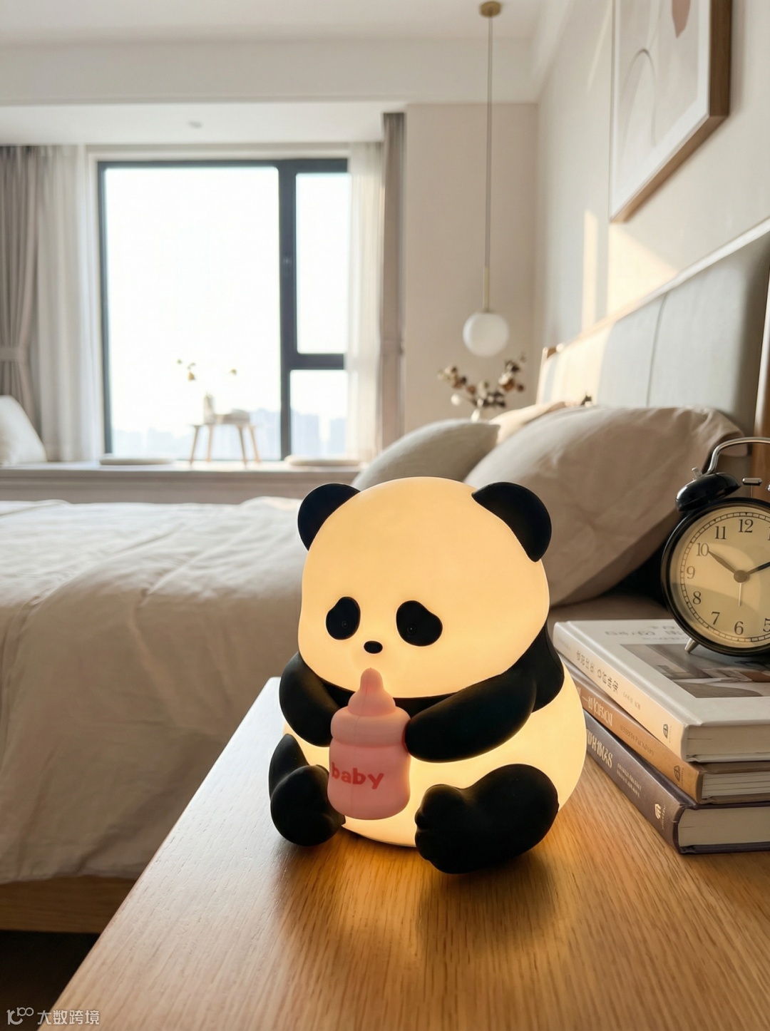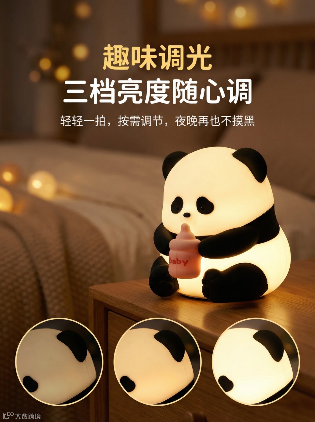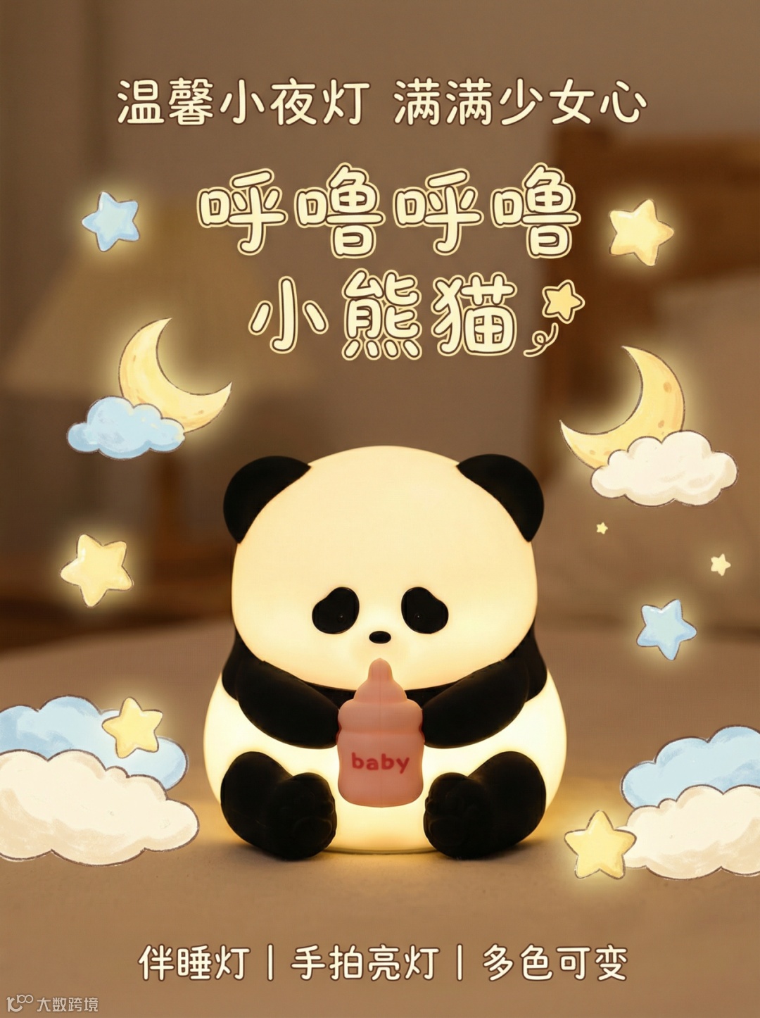 传统拍一张熊猫拍拍灯的推广图片,需要布置温馨的卧室背景、调整暖色灯光。