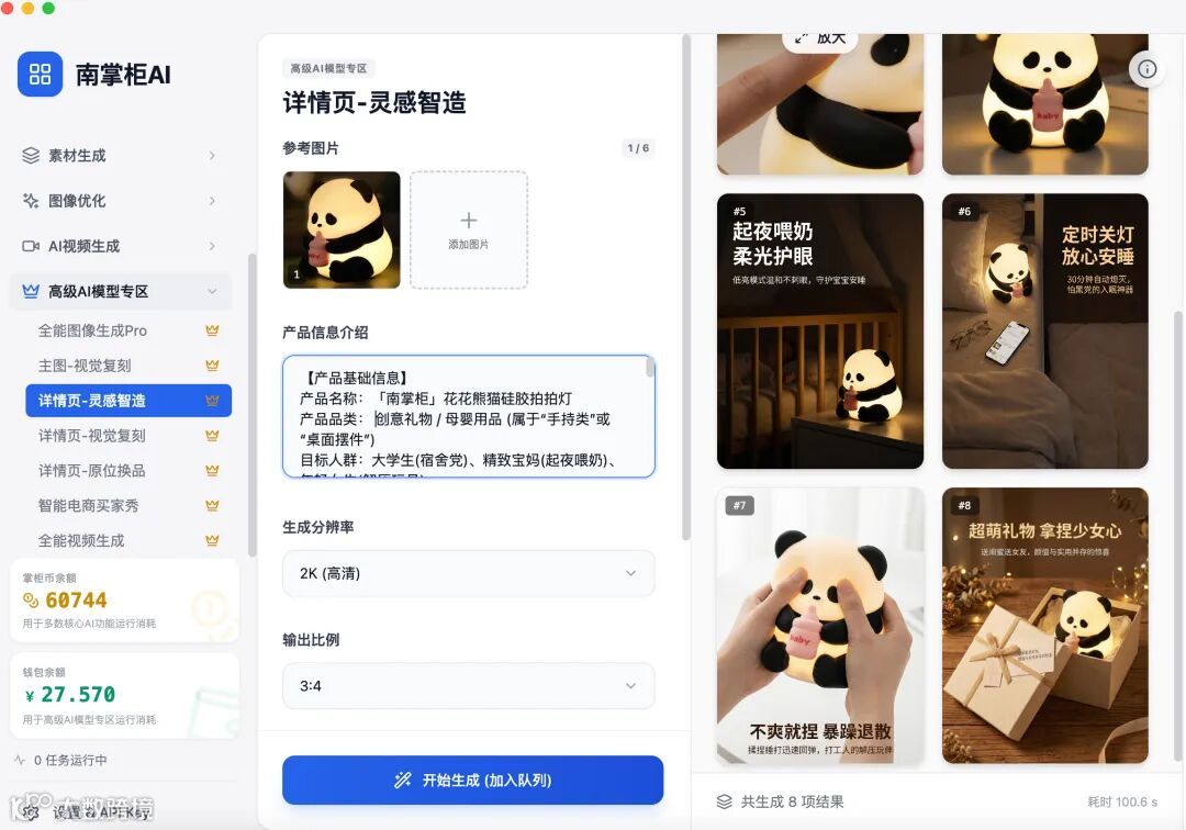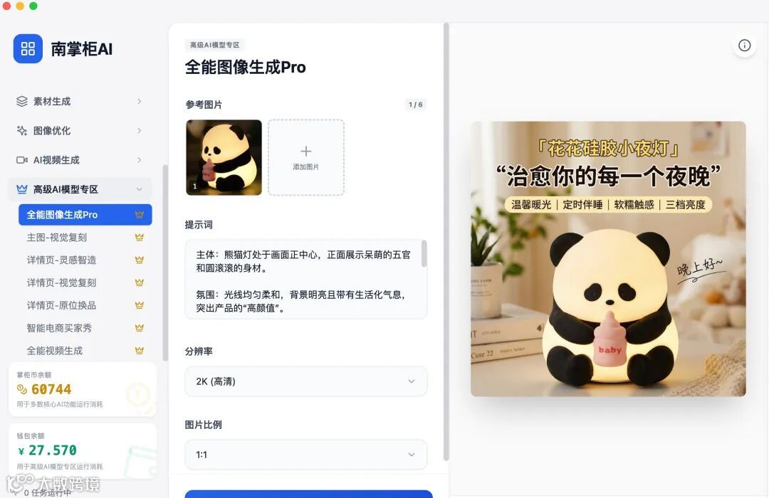 在南掌柜AI,你只需上传产品底图和提示词(产品信息、背景需求、文案卖点等),一键就能生成符合需求的电商推广图!