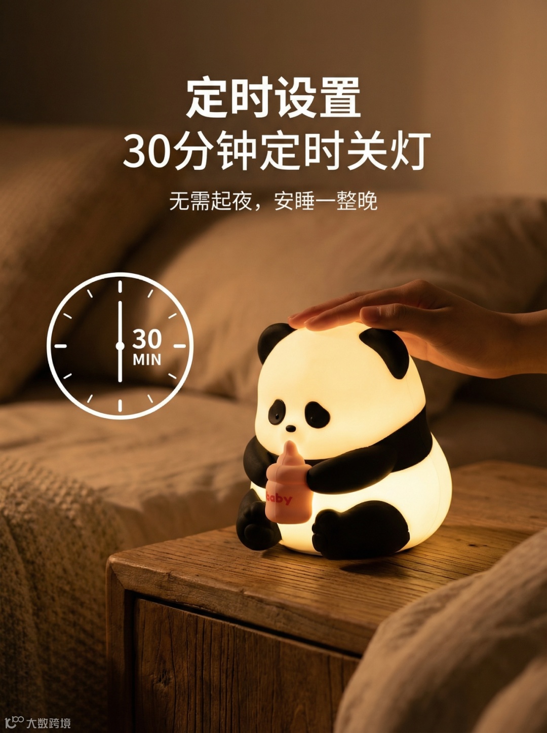 卖点标签:中间横排展示了四个核心卖点:温馨暖光 | 定时伴睡 | 软糯触感 | 三档亮度。
