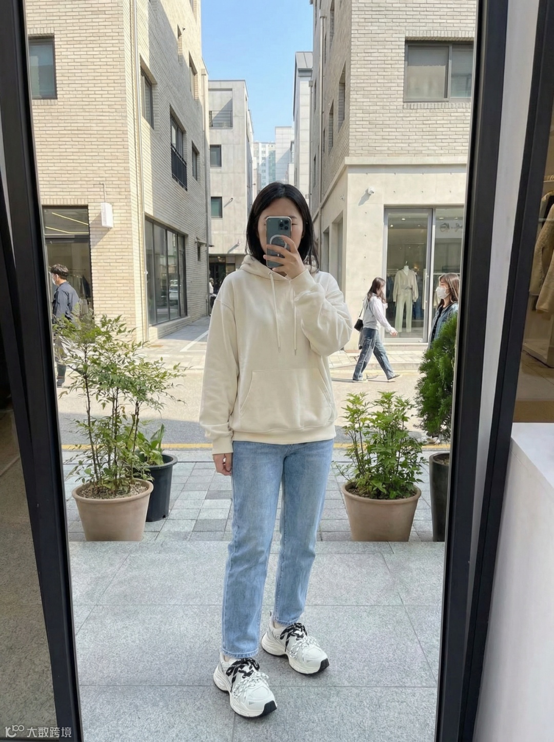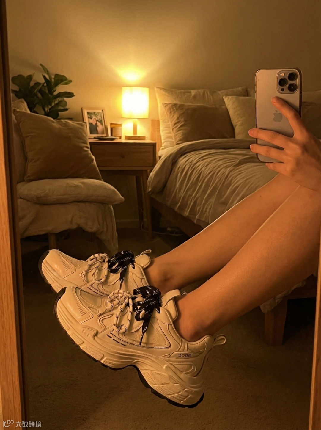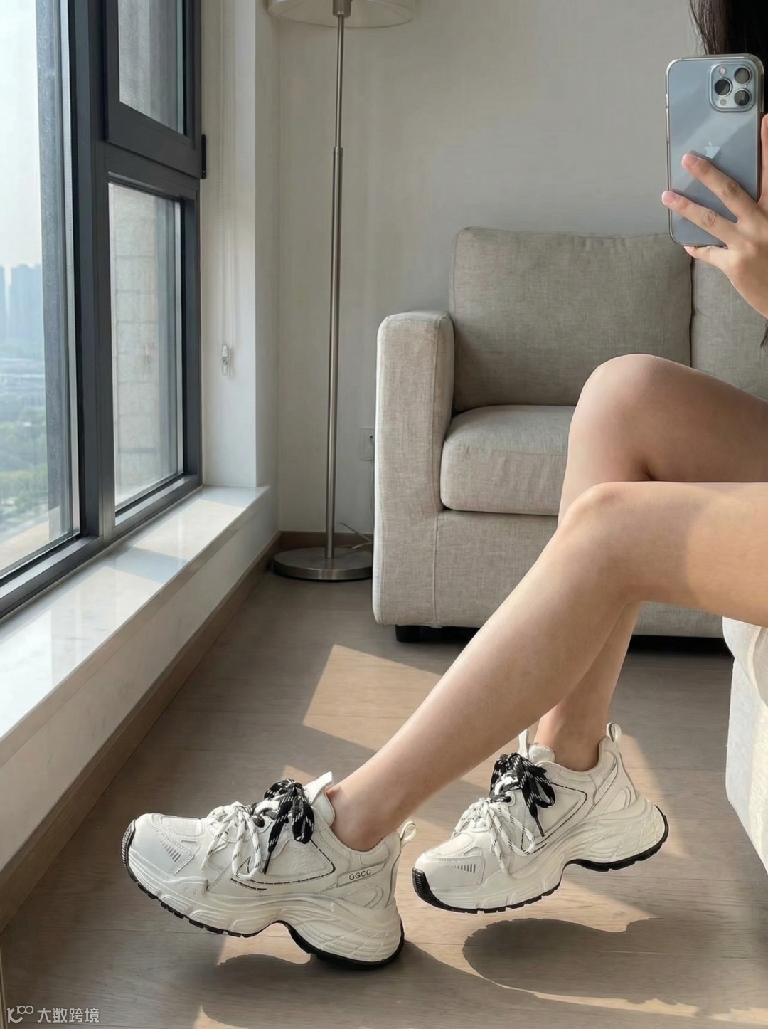 该功能能生成极具生活气息的实拍效果图。模拟真实的自然光和手机拍摄视角,展示老爹鞋在真实穿搭中的美感。