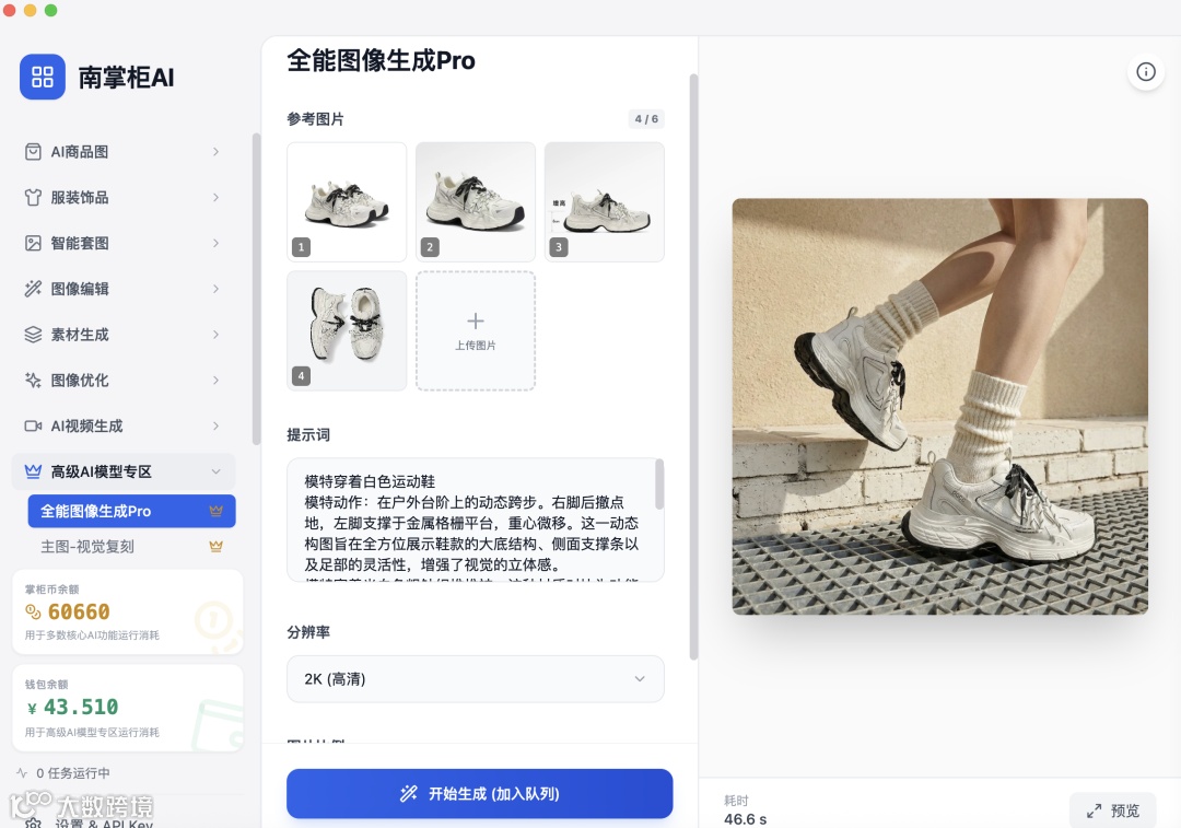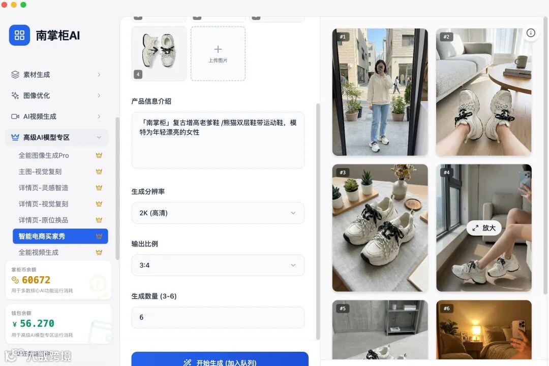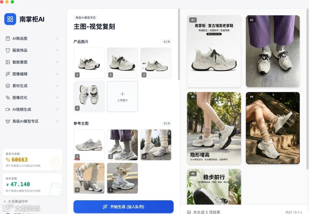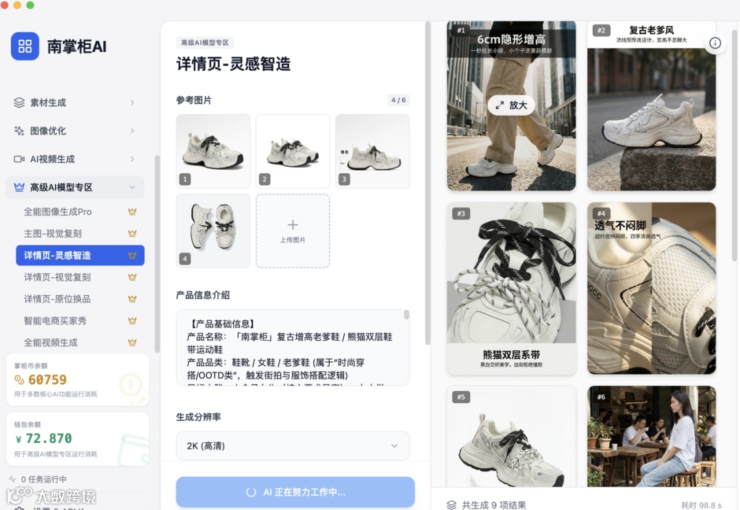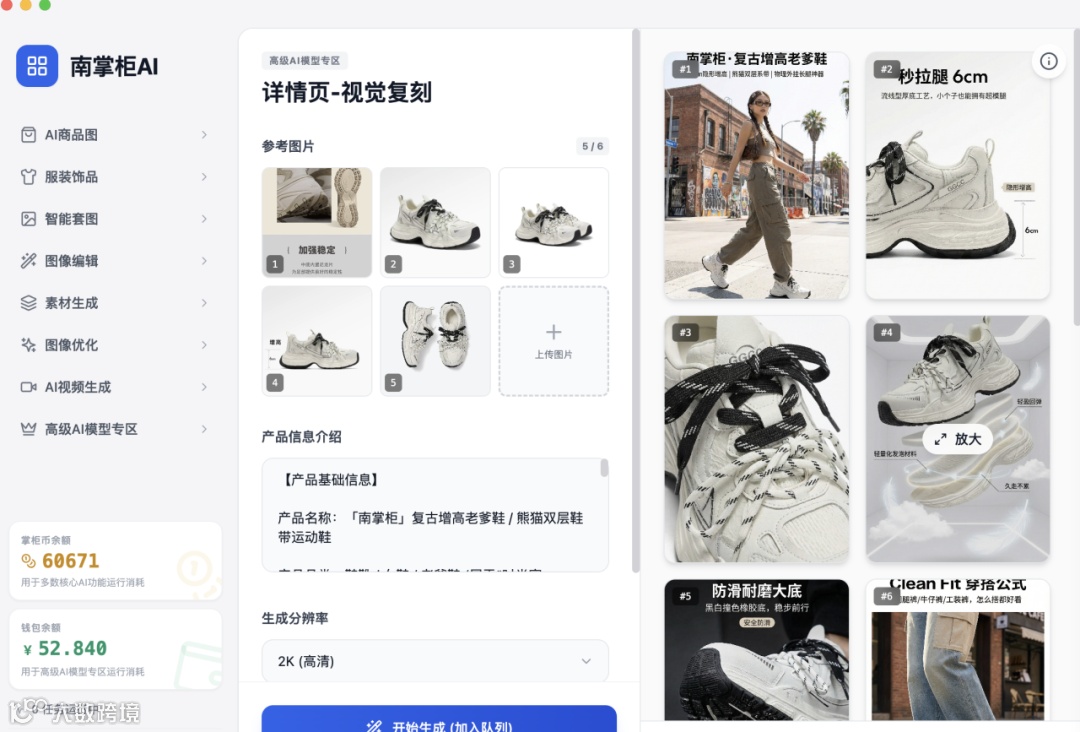 今天就以这款“复古老爹鞋”为例,实测南掌柜AI如何助你实现视觉素材的降本增效。