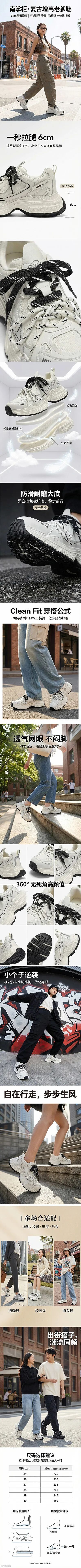 3. 工艺/技术 (Tech):6cm 老爹鞋流线型厚底工艺(前低后高,符合人体工学,显高的同时不显脚大),轻量化发泡中底(告别“搬砖感”,暴走一整天也不累)。