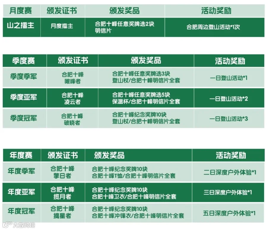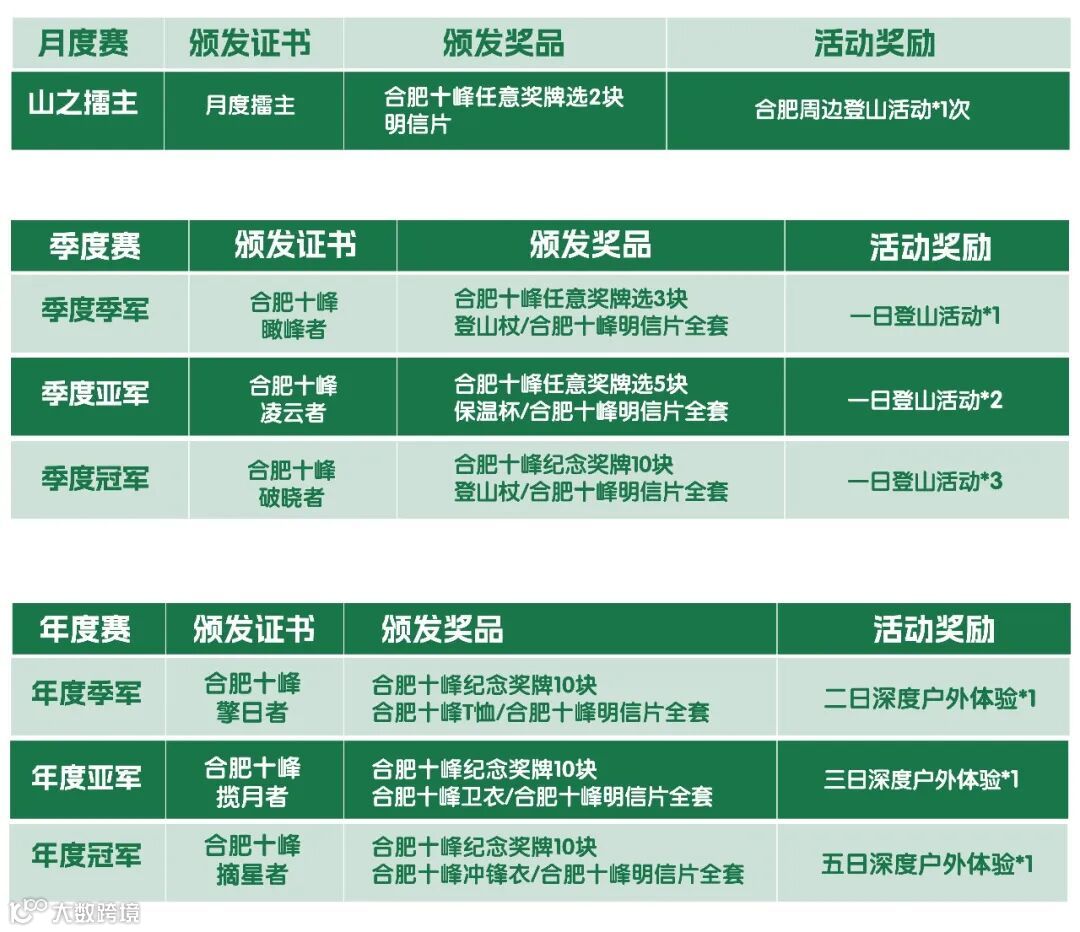 根据安徽行者小程序合肥十峰专栏季度统计排名,评选出季度单个山峰打卡次数最多一位登山者,2026春夏秋冬四季,评选出累积前120位四季优胜者,每月每座山峰前1位,共计10位。