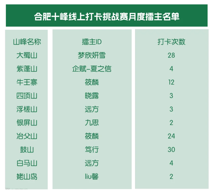 经过一个月的激烈角逐,首届合肥十峰年度线上打卡挑战赛的首个月度擂主正式诞生!来自全市的登山爱好者们以脚步丈量十峰,用坚持书写热爱。