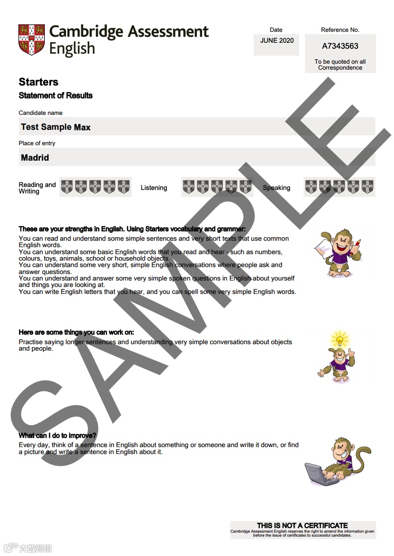 剑桥YLE证书示例