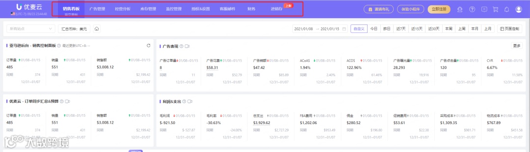 优麦云提供一个全面的首页看板,卖家可以在一个页面中同时查看店铺的所有关键数据指标,包括每日出单、利润、广告花费、库存变化等。通过这些数据,卖家可以快速对店铺的经营状况作出反应,及时调整策略。
