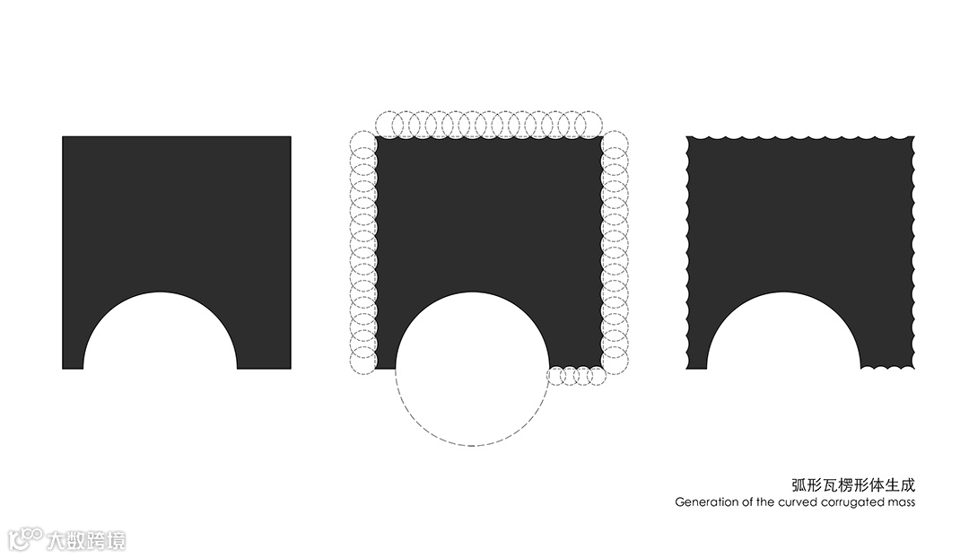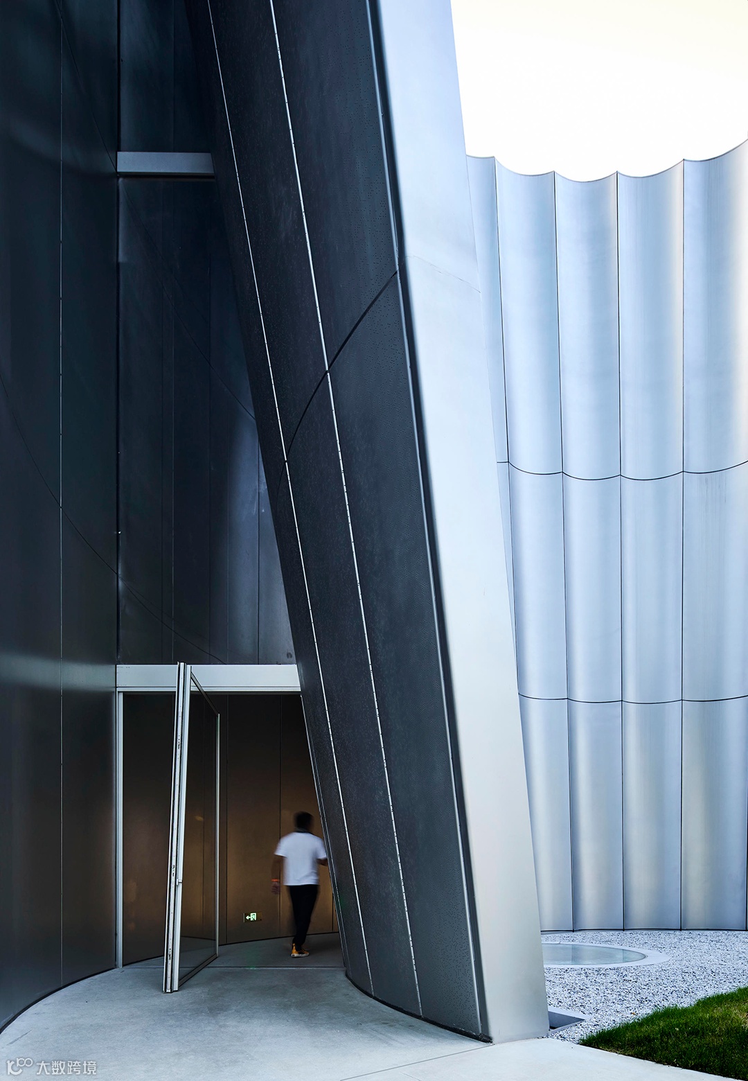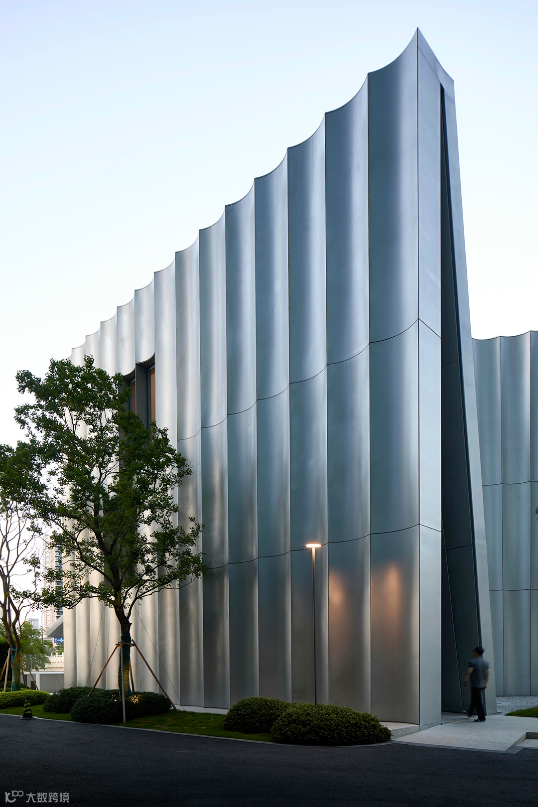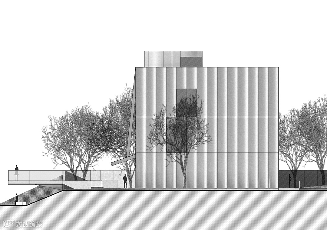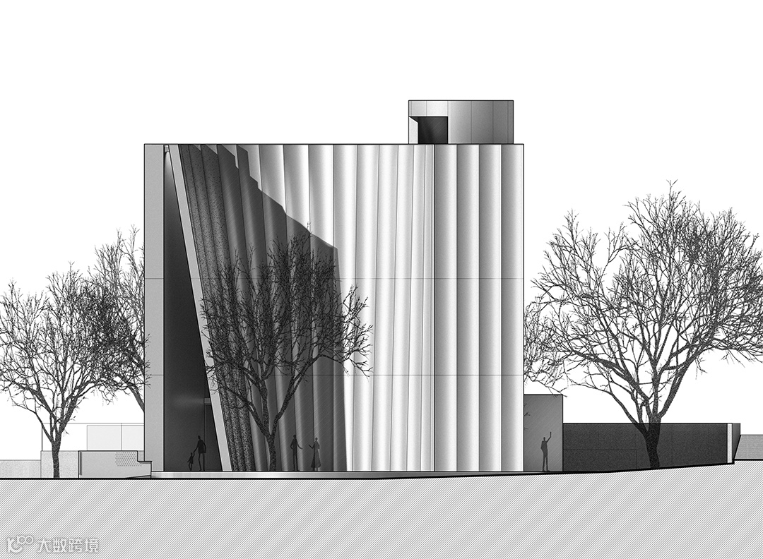 立面采用弧形钢板,不仅与半圆形的基础体量取得一致性,也借用弧形板自身的张力达到所需强度,省去了通常需在背后设置的龙骨。