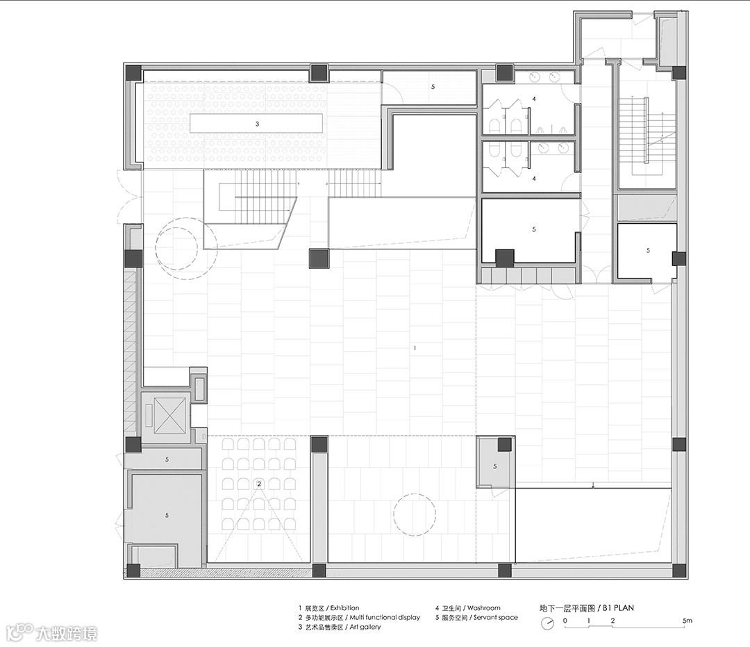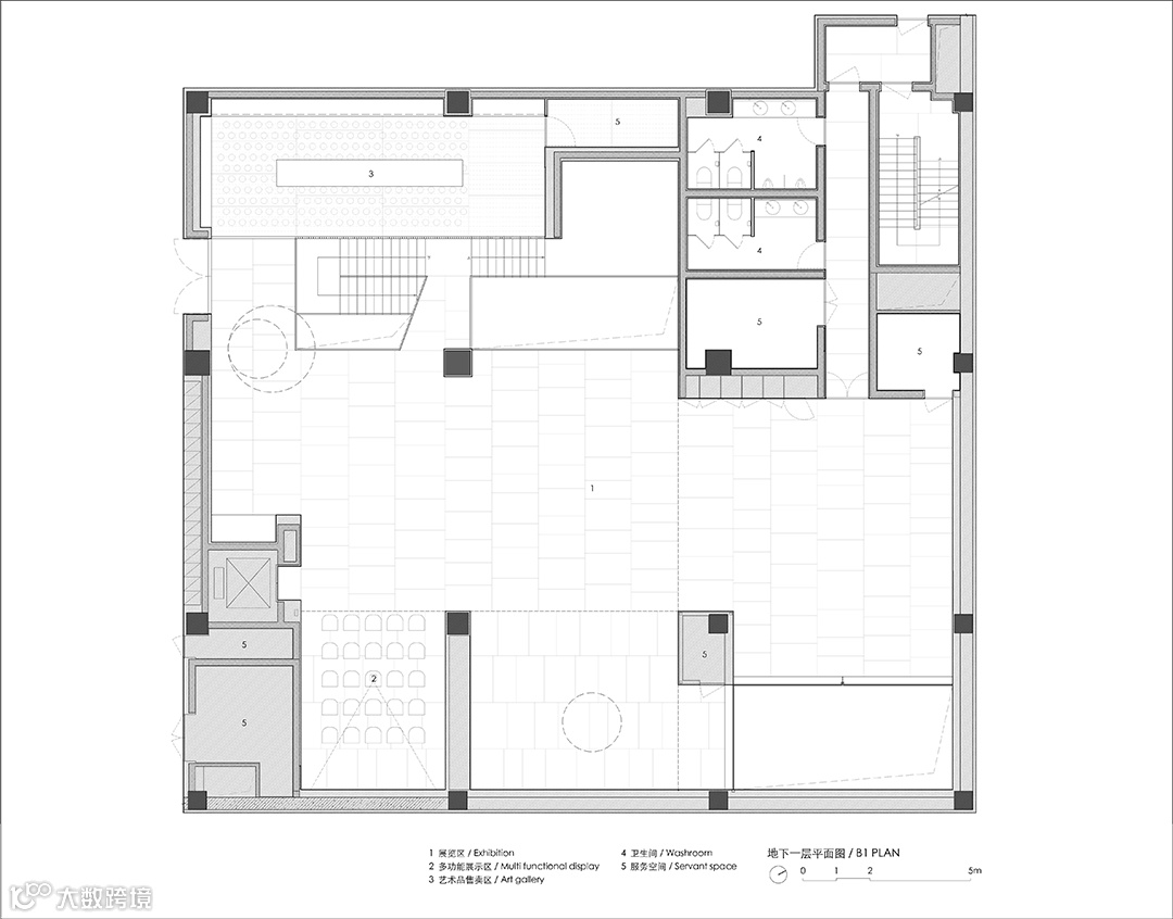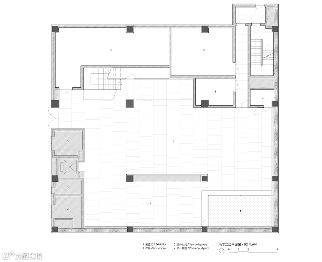 大部分展厅被设置在地下室空间,为使这一纯地下空间获得与地上部分的联系,在靠近外墙的位置拆除了部分原有楼板,室外的自然光得以从这里引入至地下空间。