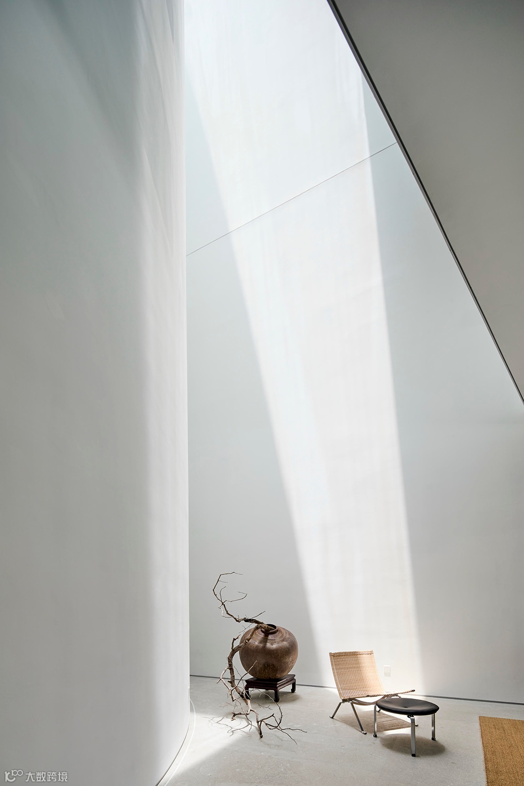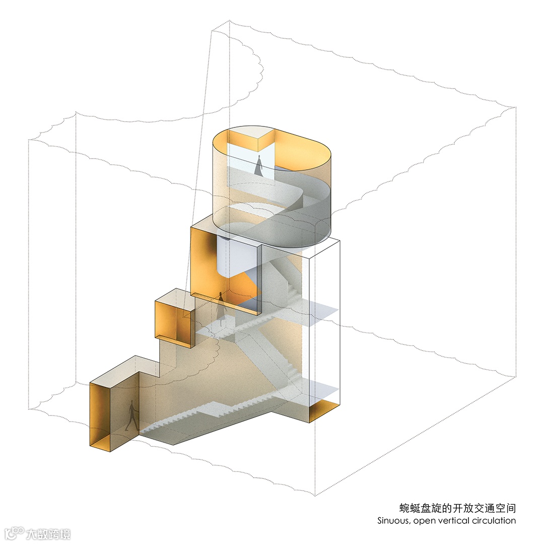 在建筑体弧形的一角,将地上三个楼层空间打通,挑空并逐层收缩,顶部天光穿越整个楼体,照亮了建筑最深处的角落,化解了此处原本锐角空间的窘迫,将这里塑造为垂直高耸的精神性空间,在建筑最深处将地上三层空间联结起来。