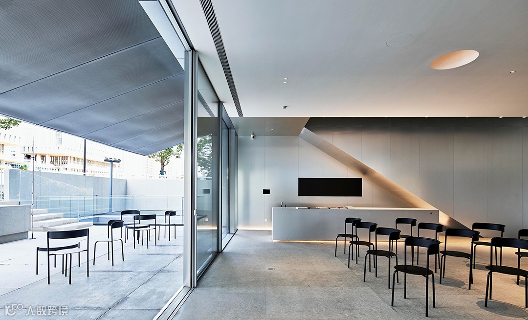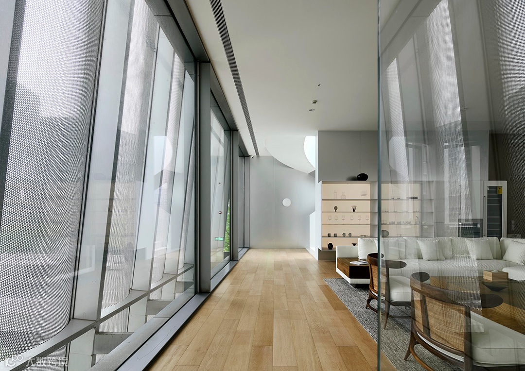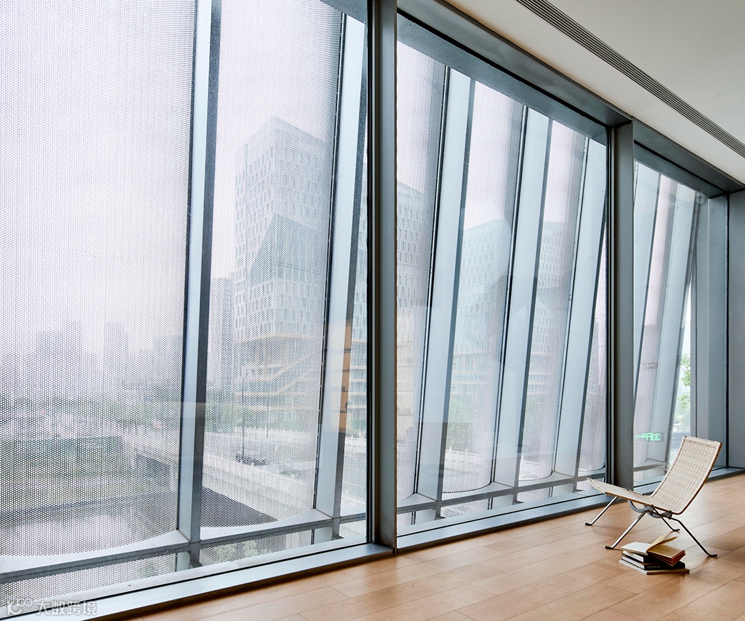 整个正面采用不锈钢板冲孔处理,使室内空间完全开放,一览无余地朝向城市;而从外部看来,建筑仍保持着独立完整的形态。室内透过完整的落地玻璃与冲孔不锈钢板看向城市,一幅巨幅城市画卷经冲孔板过滤后变得模糊而抽象;外界光线经过筛选,柔和地渗入室内。