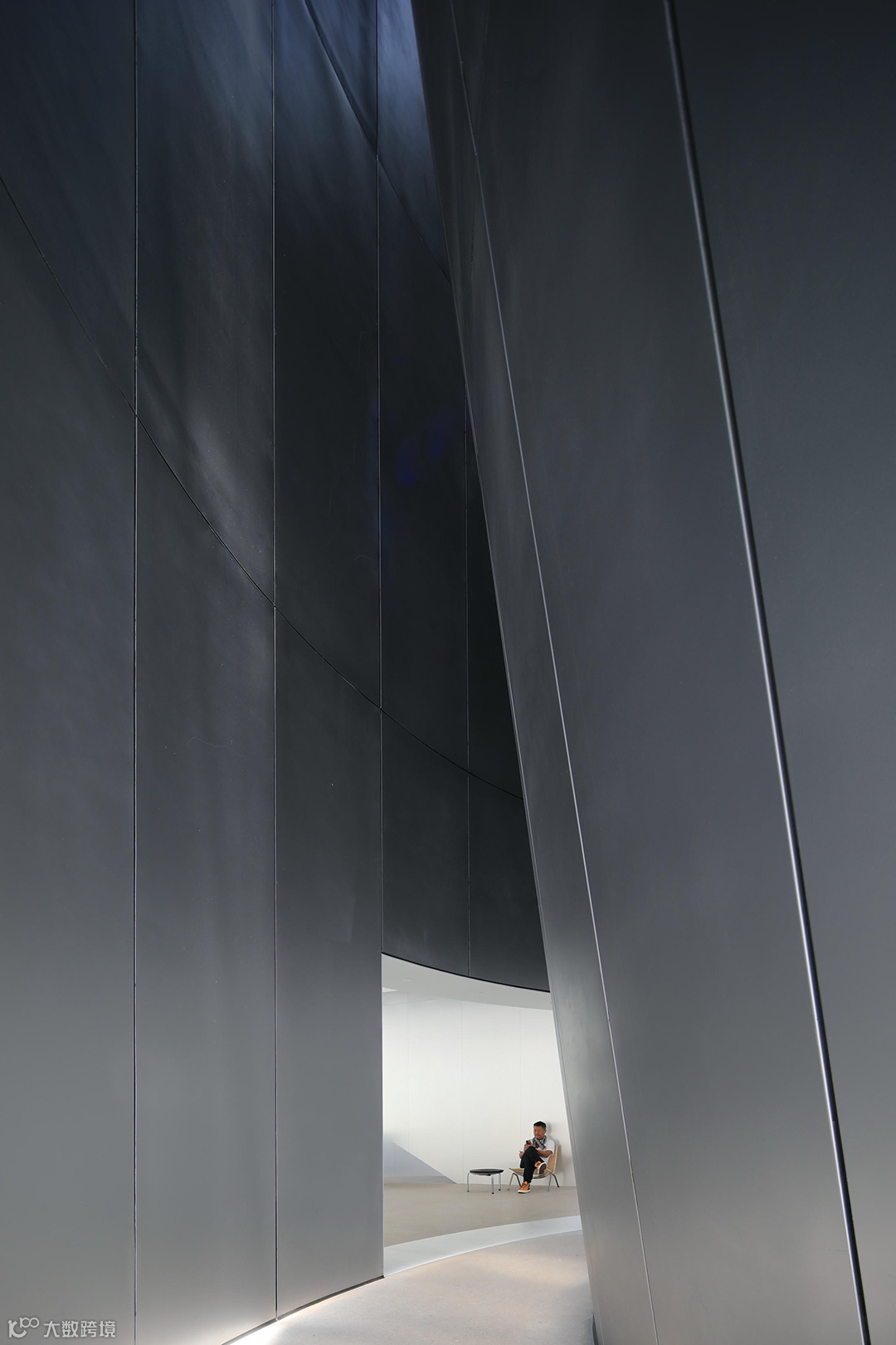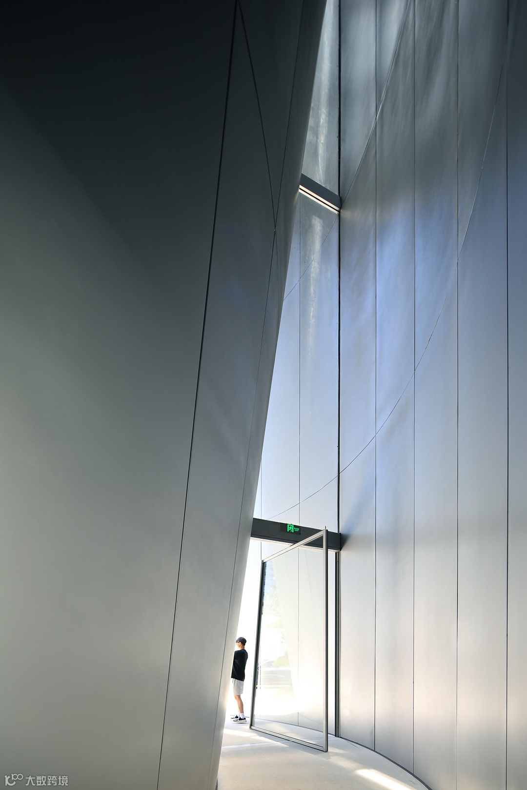 自然光从高处的缝隙中渗入,顶部的光线、侧墙的弧线与金属墙面材料的半透明性所带来的感受相互叠加,形成一瞬间超自然的体验,是进入建筑前的精神礼遇。
