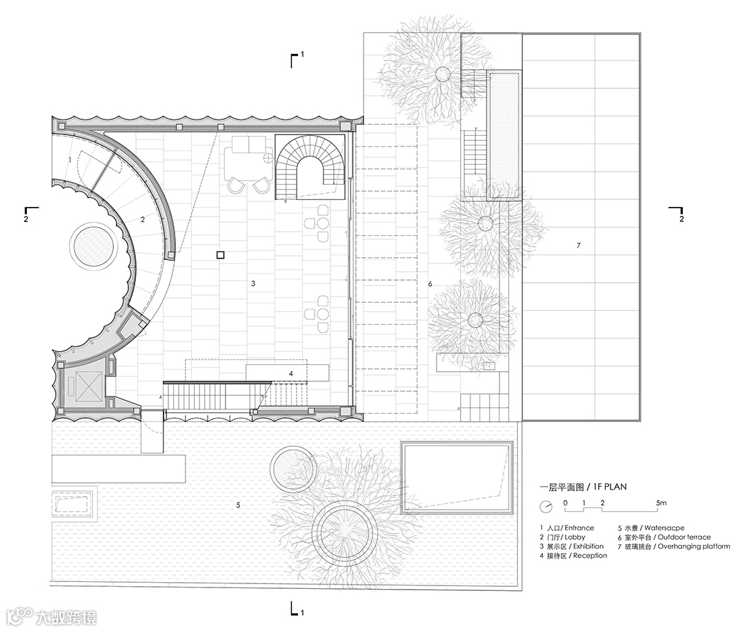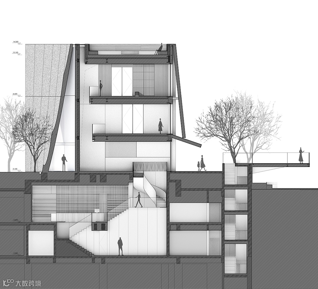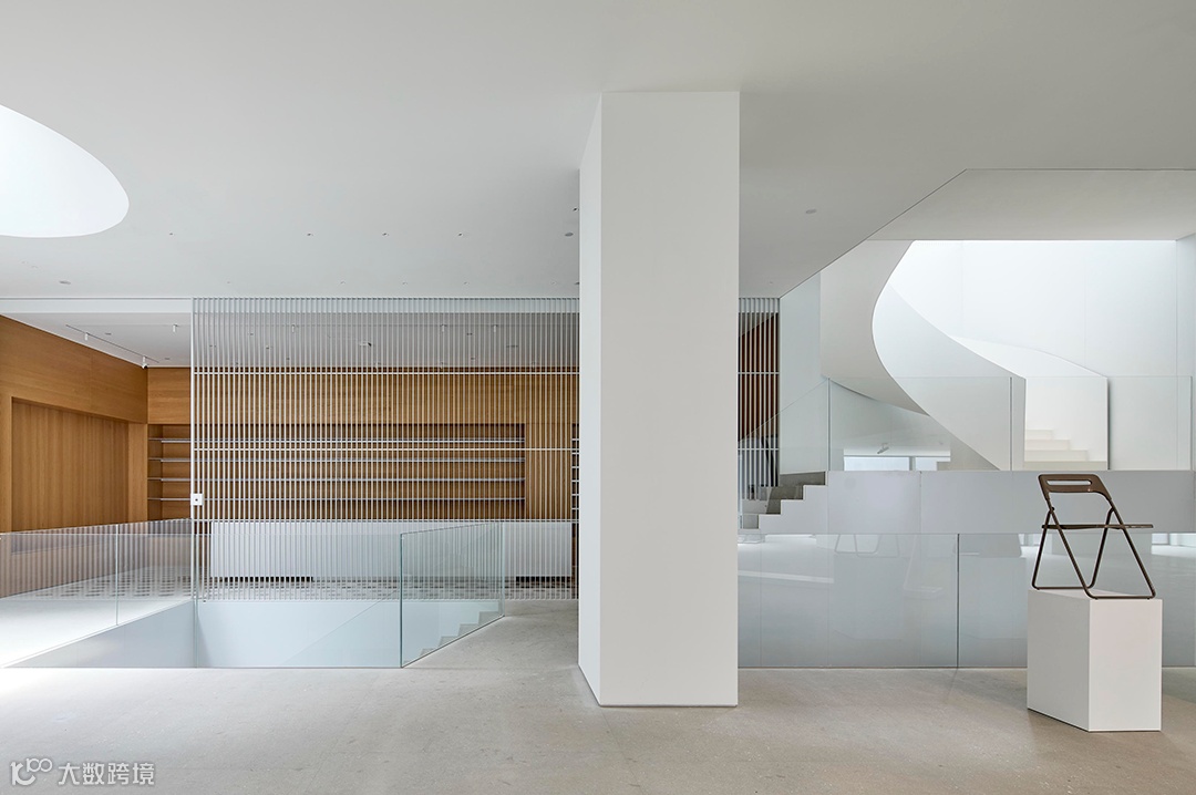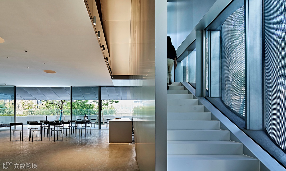 交通顺势而为,回旋转折的楼梯由此引入,将这条路径穿越地上与地下,自然光透过空间的转换,将上下楼层的空间联系在一起,地上和地下被整合成了一个连续的整体。在地下空间的另一角,通过拆除部分的楼板将原本地上的景观下沉到地下的室内,为地下展厅带来一片静谧的自然。