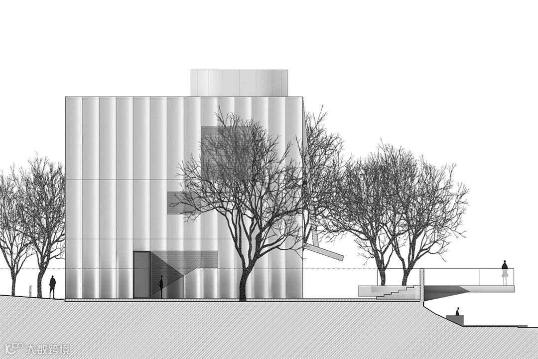 这栋面积不大的美术馆正前方面对着一条穿城河流,侧边紧邻城市主干道,因此它不仅属于社区,也属于城市的一部分。建筑朝向城市的一面被“掀开”,将原本被包裹完整的空间打破,撕裂的外壳让这座建筑变得既独立又开放。