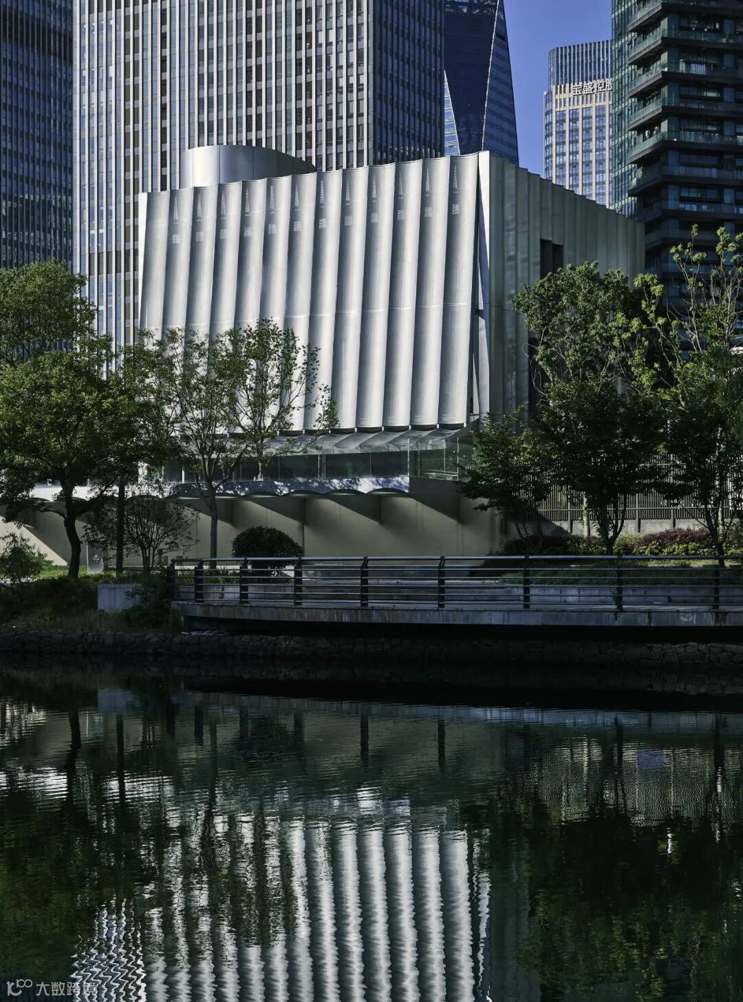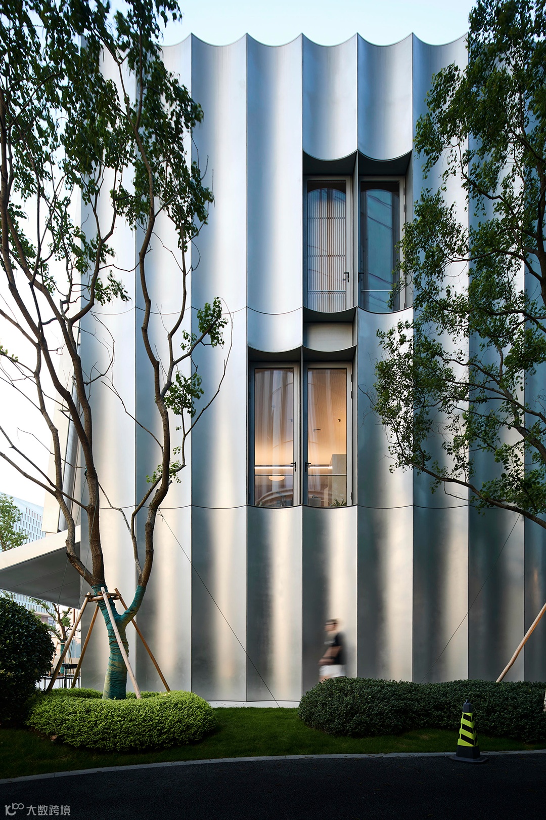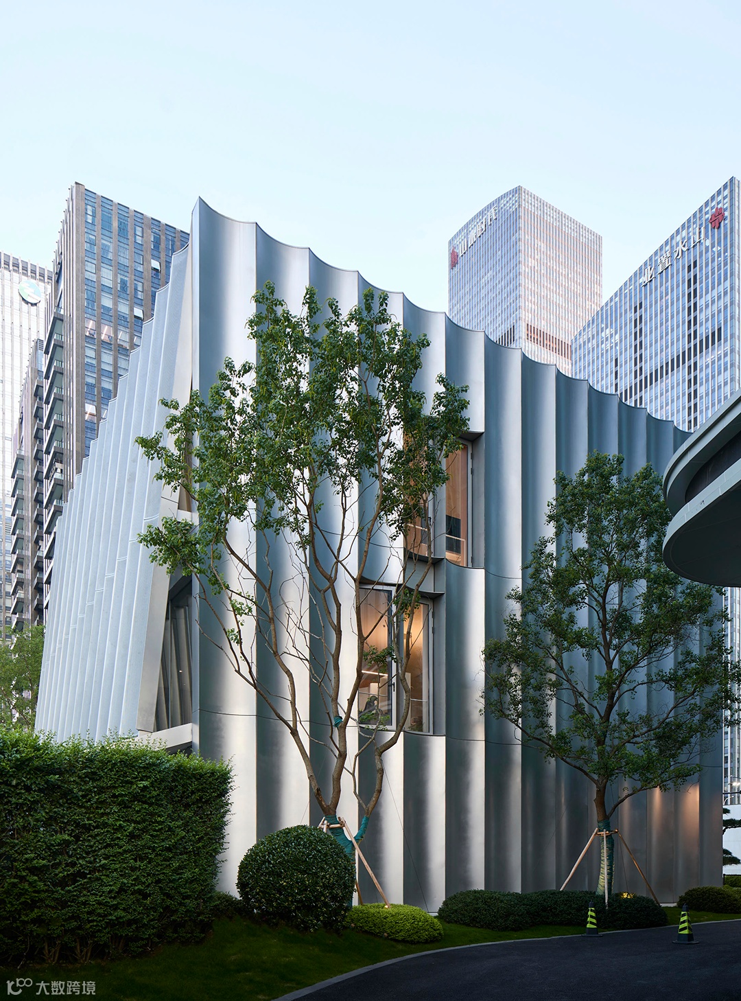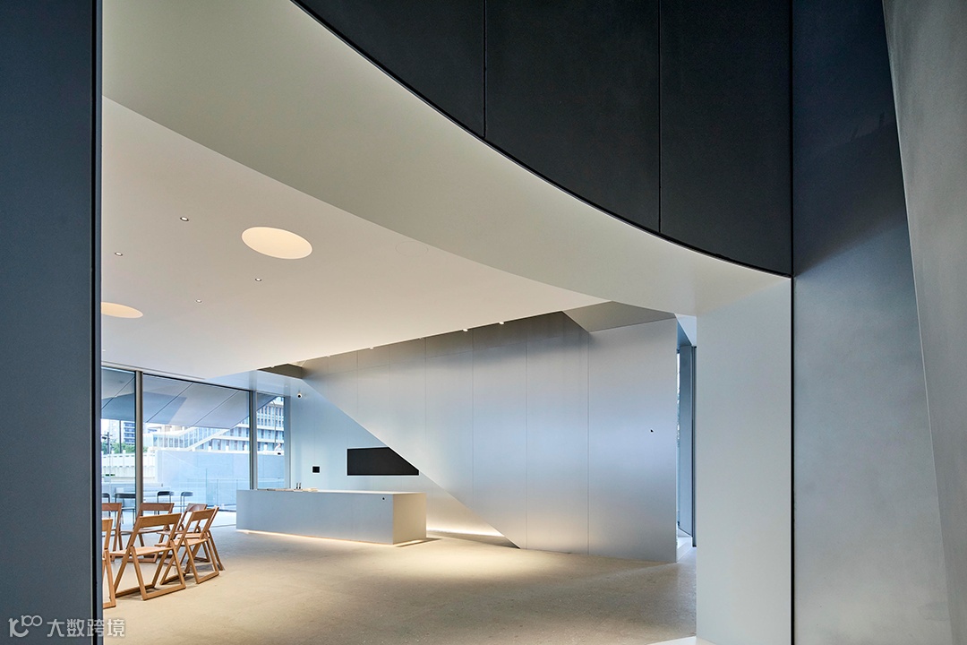 透明连续的弧面板形成的波浪形态赋予建筑自身秩序,光线借助不锈钢曲面形成的反射,产生出微妙变化,唤起了建筑体量如雕塑般的柔情感受,使其呈现出优雅的姿态。