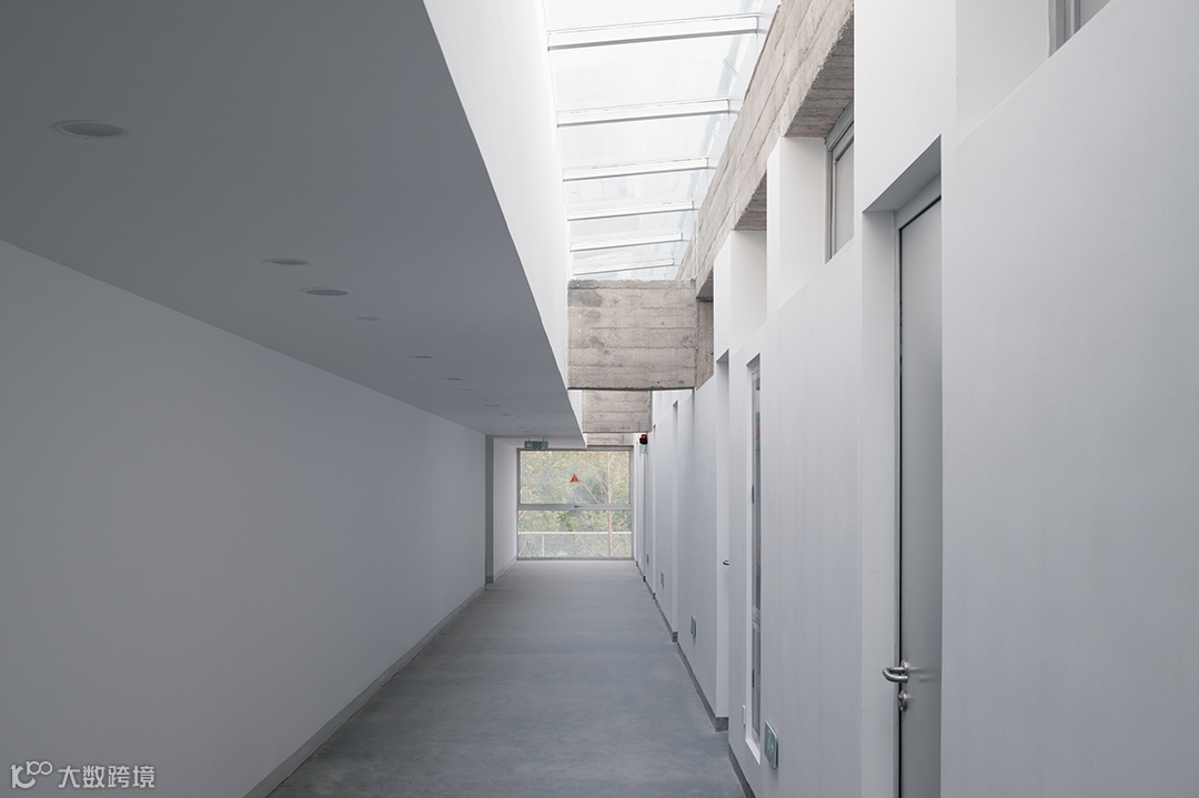 通长的天窗被放置在几个关键位置,让车库、宿舍走廊、卫生间、楼梯间在白天都能获得自然采光。车库天窗的形式很简单,从室内看去,就是一个朝北开口的洞。天窗和屋顶都采用钢结构体系,表面涂漆,放置在清水混凝土框架之上,分别扮演了覆盖与承重的角色。