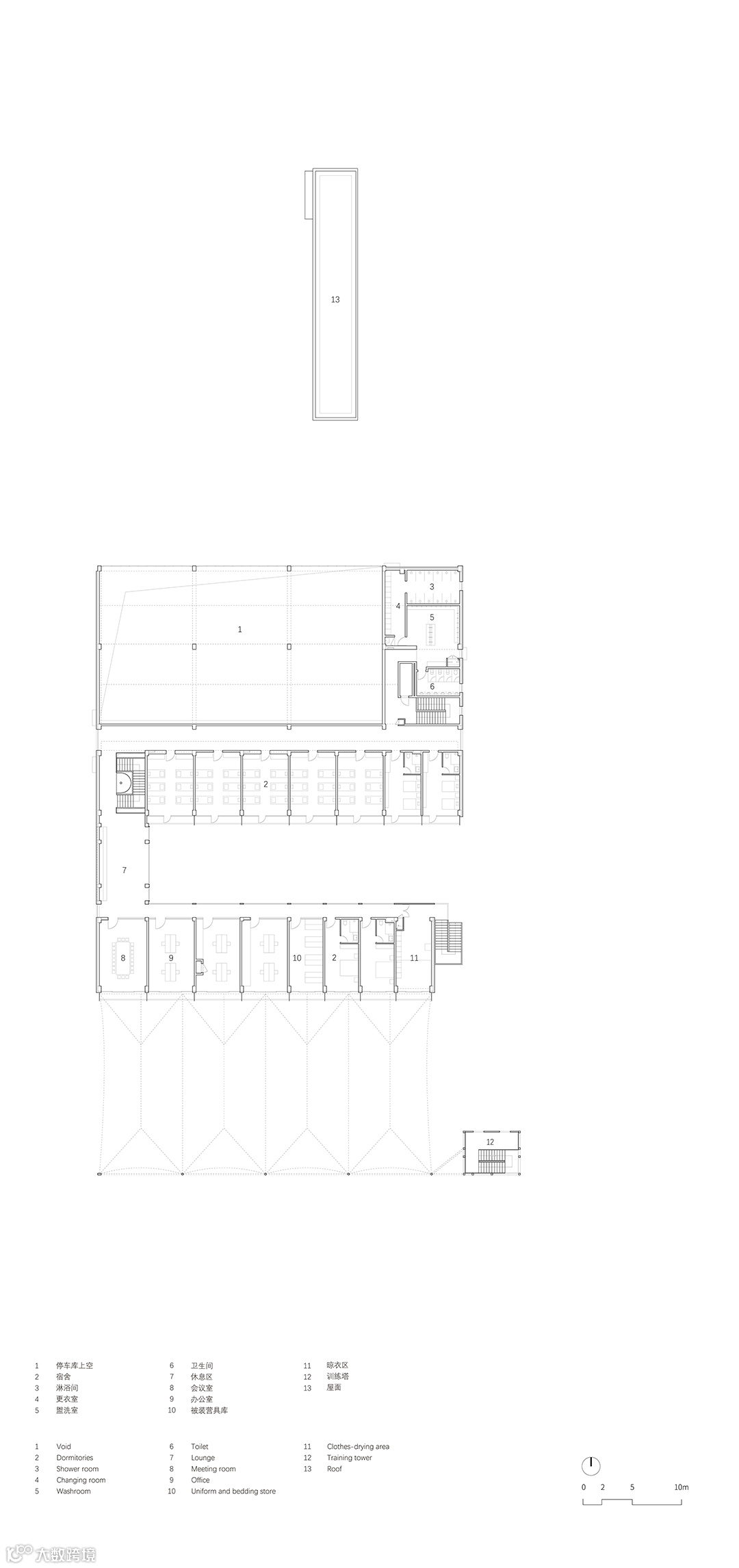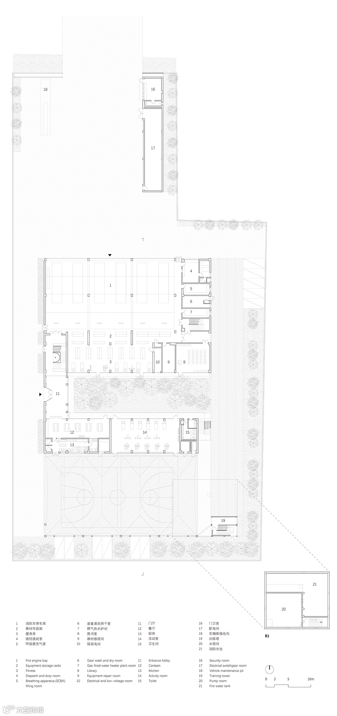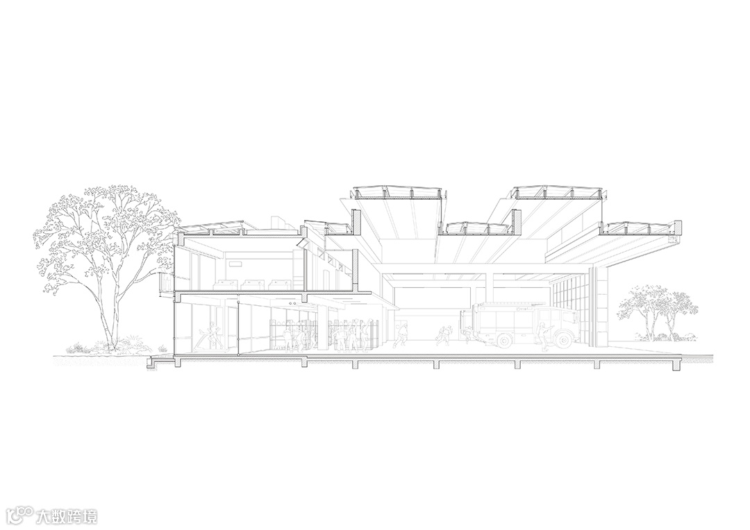 消防员的宿舍被安排在紧邻车库的南侧,朝向庭院,可以通过北侧的走廊快速出警。健身、办公、会议、娱乐也都围绕庭院组织。庭院是这个建筑的另一个中心——等候与日常生活的中心。