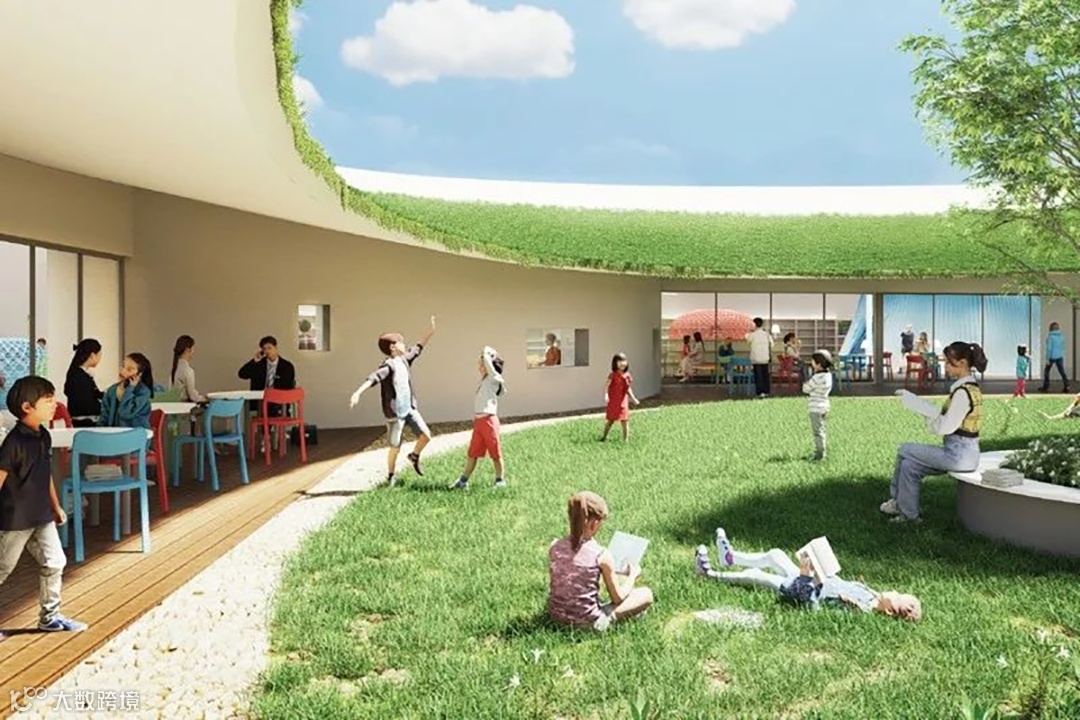 图书馆环状结构围合出一个内向的绿色庭院,营造闹中取静的氛围,为儿童提供安心游玩的户外空间。屋顶与墙面通过绿化设计,结合深檐以有效降低阳光直射,打造节能且舒适的建筑。
