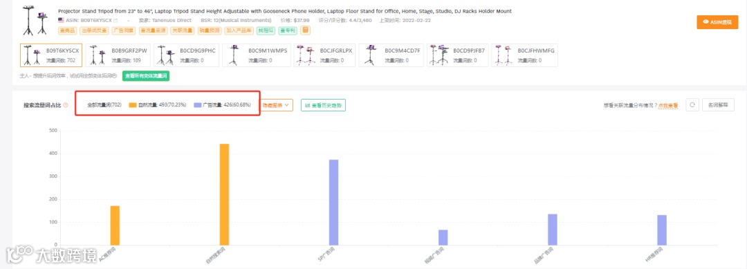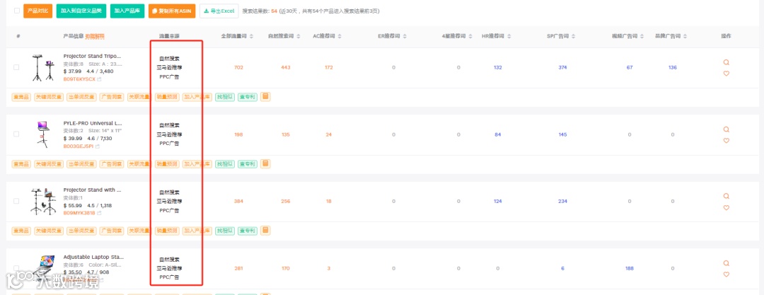 步骤3:点击查询,系统将显示该产品的流量来源,分为自然搜索流量、亚马逊推荐流量以及PPC广告流量等。通过对比不同类型流量词的数量,你可以清晰看到该产品的流量占比结构。