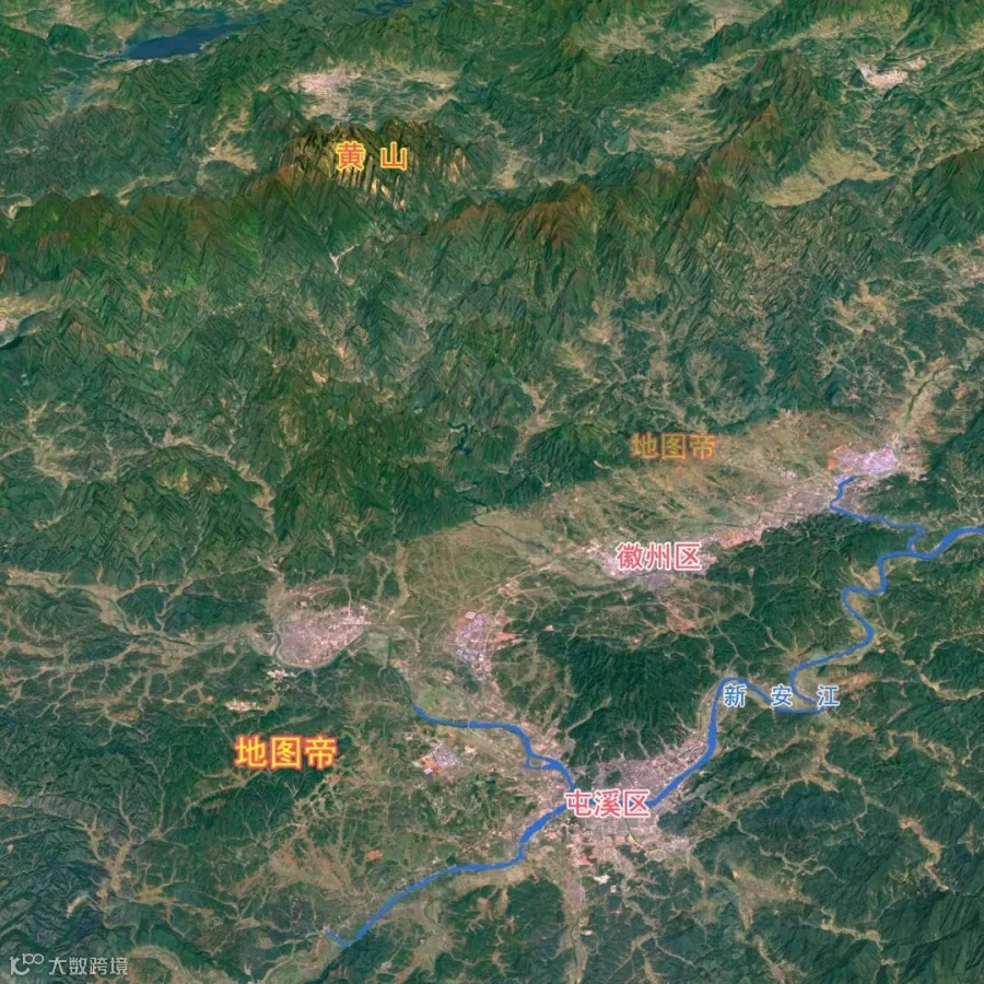 黄山市的徽州区和屯溪区,中间有山脉阻隔,分属徽州盆地和屯溪盆地。徽州区在丰乐河上,徽州古城在歙县丰乐河汇入练江处,练江向东南汇入新安江。屯溪区在横江与率水交汇城新安江处,城区海拔120-130米,市中心纬度是北纬29°42′53″。
