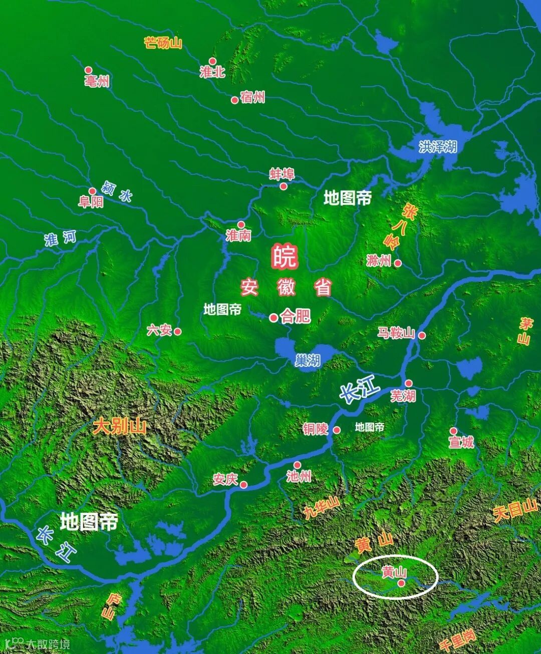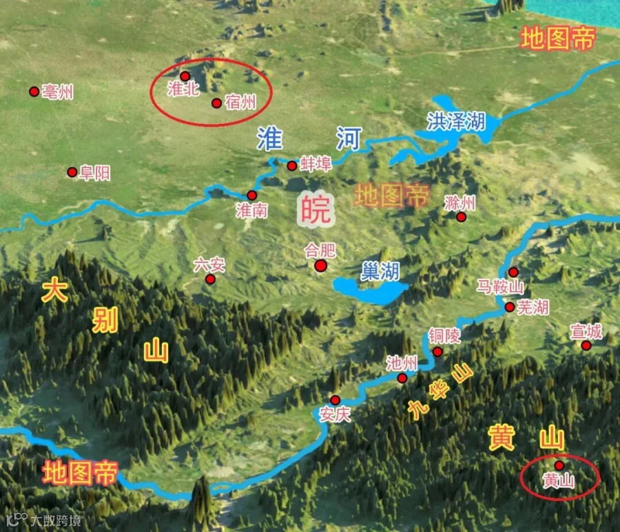 安徽北部的淮北、宿州、亳州属淮北,是暖温带半湿润季风气候,地形一马平川,典型的中原文化圈,方言为中原官话,主食以面食为主;南部的黄山属江南,是亚热带季风气候,地形山峦叠嶂,是徽州文化区,方言为徽语,主食以米饭为主。