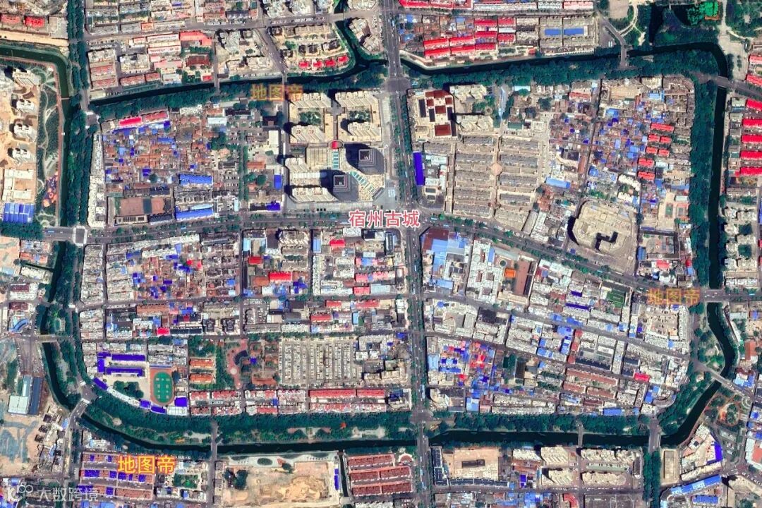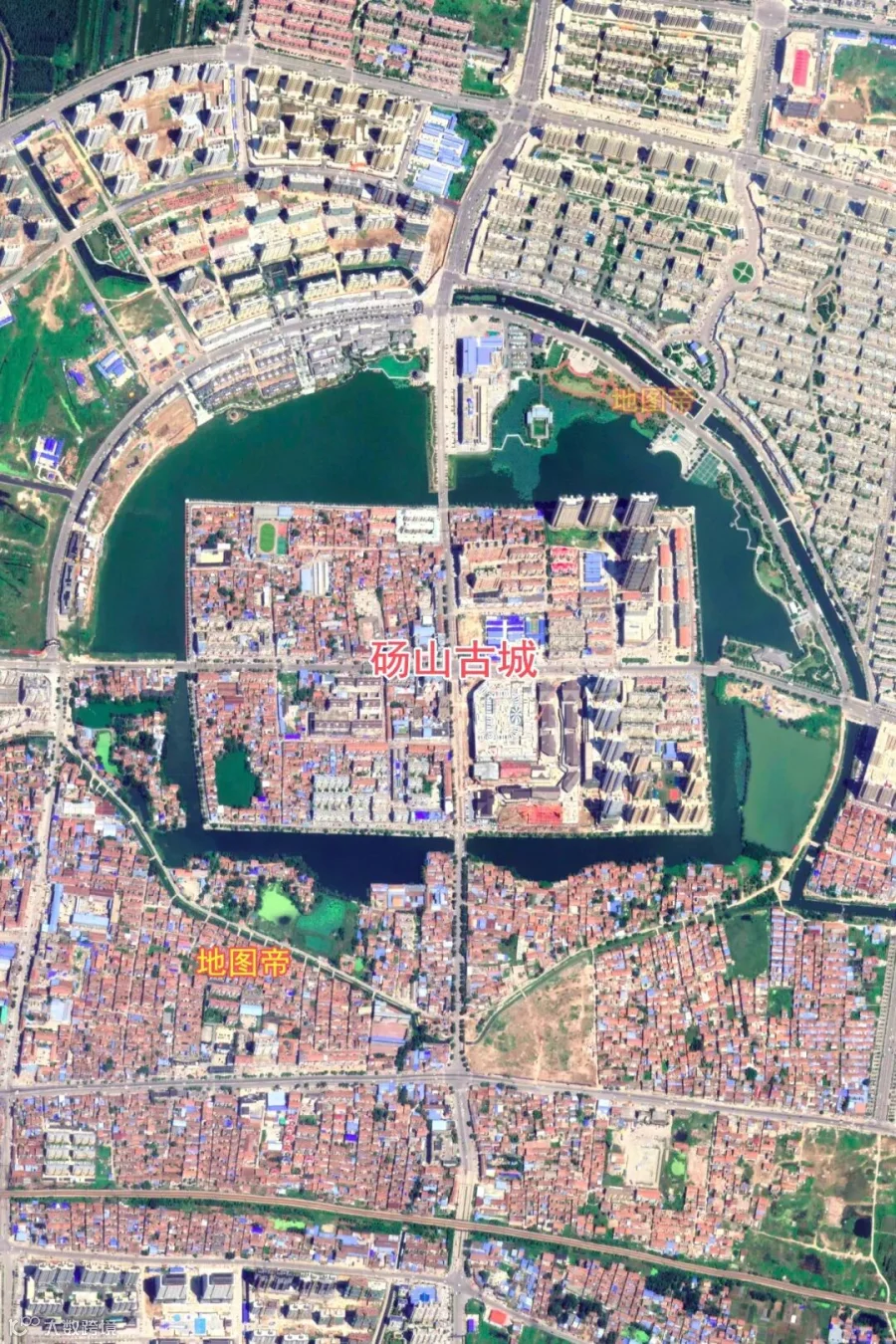 砀山古城,外圆内方,城墙呈方形,面积0.62平方千米,护城河呈圆形,面积1.6平方千米(环湖公路内)。砀山古城开四门:景云门(东),永保门(南),瑞洛门(西),企宁门(北)。