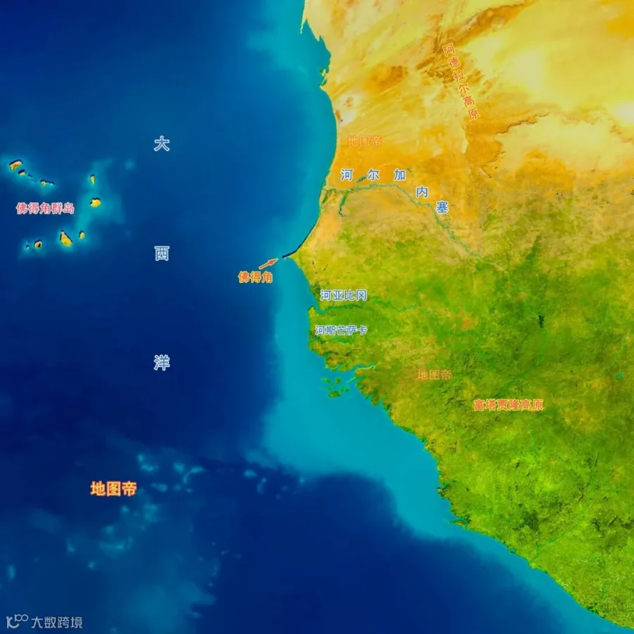 佛得角半岛,西濒大西洋,位于非洲大陆的最西端,坐标是北纬14°44′41″、西经17°31′13″。佛得角半岛像个鱼钩深入大海,属塞内加尔。