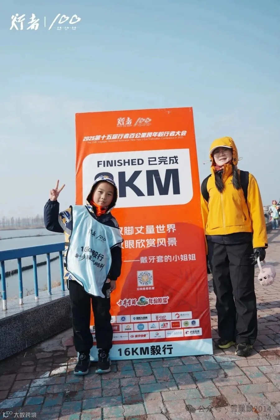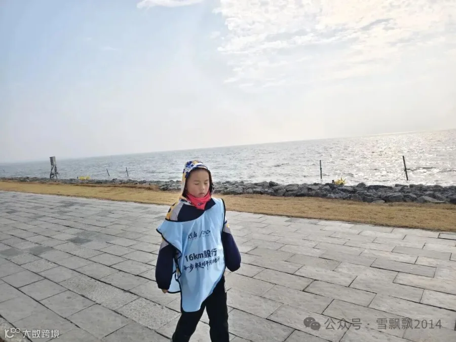 就在我们走到12公里处时,前方出现了那个熟悉的身影——姐姐从15公里处折返,迎向我们。弟弟眼睛一亮,冲过去给姐姐一个大大的拥抱。那一刻,寒风似乎都温柔了许多。
